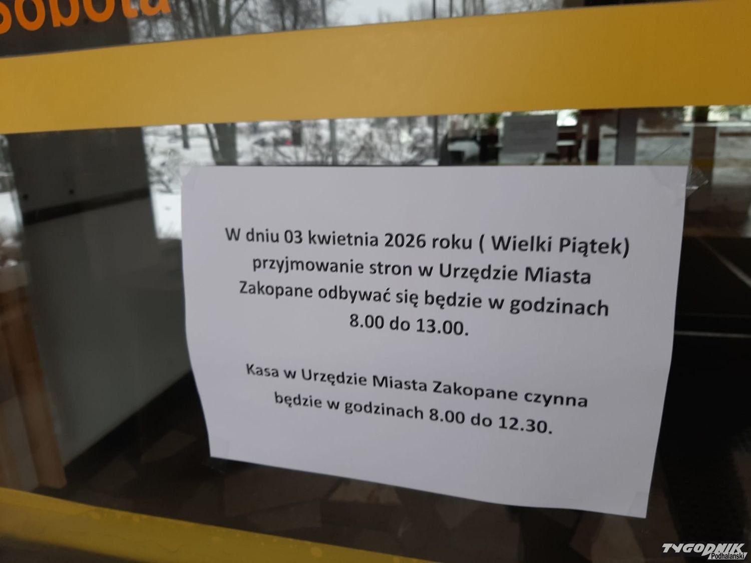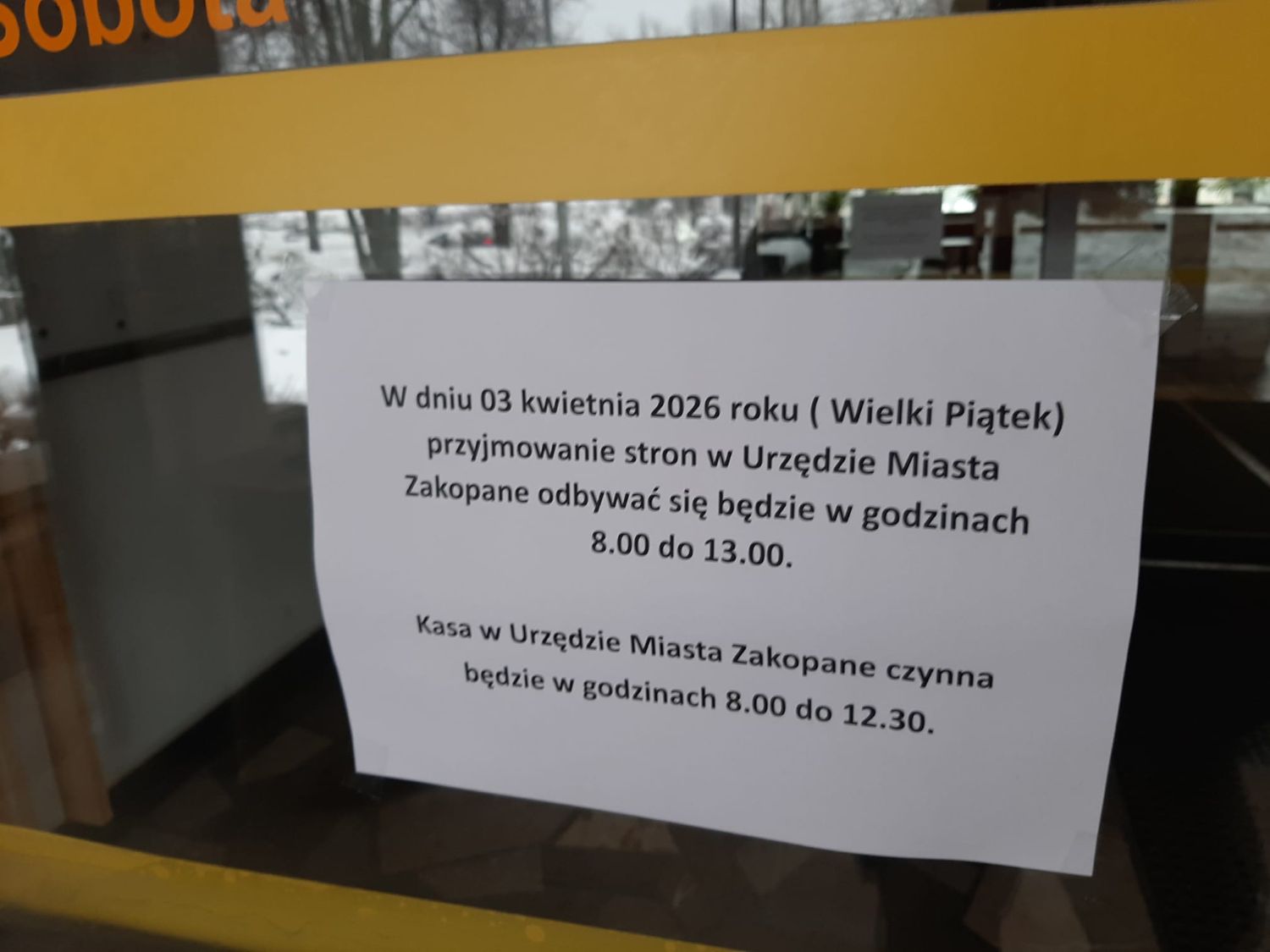 W piątek 3 kwietnia mieszkańcy Zakopanego będą mogli załatwić sprawy urzędowe krócej niż zwykle. W związku z Wielkim Piątkiem zmienione zostaną godziny obsługi w magistracie oraz pracy kasy.