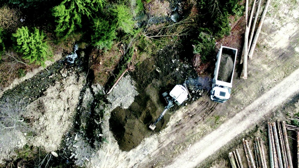 Dodatkowe wątpliwości budzi stan potoku i jego brzegu, który bezpośrednio przylega do tej parceli. Widoczne są ślady prac ziemnych, które mogły mieć na celu poszerzenie działki. Mieszkańcy, z którymi rozmawialiśmy, twierdzą, że koryto potoku zostało przesunięte o kilka, a nawet kilkanaście metrów. Analiza zdjęć z drona oraz obserwacje w terenie pozwalają stosunkowo łatwo ustalić, którędy wcześniej przebiegało koryto cieku.