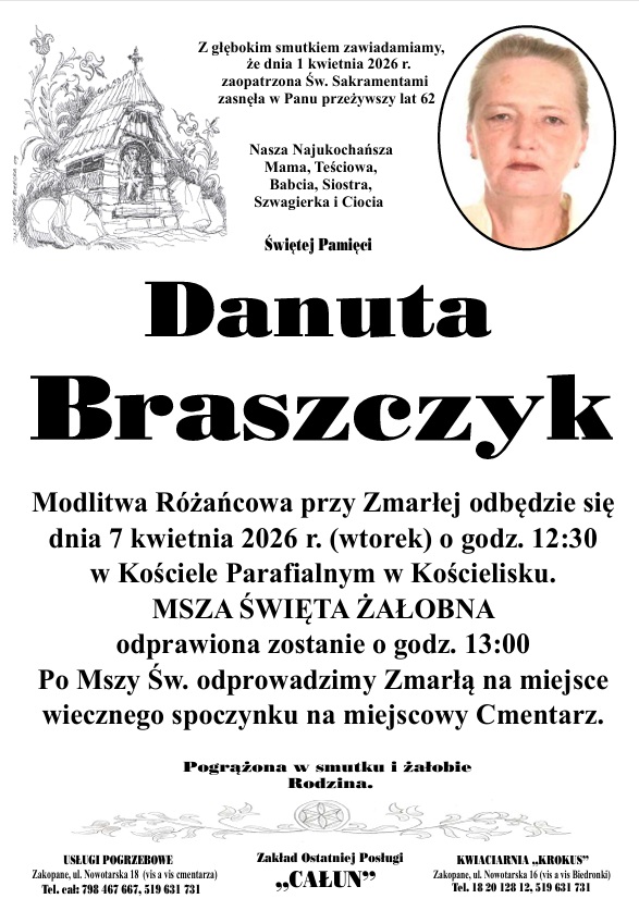2026-04-03 11:16 Szlaki w Tatrach ponownie otwarte, ale zagrożenie lawinowe nadal wysokie 2026-04-03 10:48 Uciekł przed policją do lasu 2026-04-03 09:56 Od czterech dni nie ustają poszukiwania Bandziora. Rodzina bardzo tęskni za psem 1 2026-04-03 09:01 Tatrzański Park Narodowy pozostaje zamknięty. Wysokie zagrożenie lawinowe i niebezpieczne warunki 1 2026-04-03 09:01 Poznaj powody, dla których warto zainwestować w porządne oświetlenie warsztatowe 2026-04-03 08:14 Znaleziono psa w Kościelisku. Trwają poszukiwania właściciela 2 2026-04-03 08:00 Zmienna pogoda pod Tatrami. Przejaśnienia po deszczowym poranku, w nocy możliwe mgły 2026-04-02 21:59 Krzyż na Giewoncie nie został rozświetlony 21 2026-04-02 21:37 Liturgia Wielkiego Czwartku w Miętustwie (ZDJĘCIA) 2026-04-02 21:35 Trzy pożary opon w jednym dniu. Alarm w Bystrej Podhalańskiej 2 2026-04-02 21:18 Gorce w śniegu. Wyprawa na Turbacz 2026-04-02 20:37 W schronisku w Pięciu Stawach turyści czekają na otwarcie Tatr. Humory dopisują (WIDEO) 3 2026-04-02 20:09 Pożar budynku w Kościelisku. Nocna akcja strażaków na Staszelówce 2026-04-02 20:02 Dzień Otwarty w CKiW OHP w Szczawnicy już za nami! 2026-04-02 19:01 Czipowanie psów i kotów w gminie Czorsztyn. Samorząd dopłaca połowę kosztów 2 2026-04-02 18:00 Spotkanie z Marią Gąsienicą-Zawadzką. Obowiązują zapisy 2026-04-02 16:59 Nocna akcja ratunkowa GOPR na Babiej Górze 3 2026-04-02 16:30 Urząd Miasta Zakopane skraca godziny pracy w Wielki Piątek 2 2026-04-02 16:16 Zwłoki 27-latka odkryte w Spytkowicach 2026-04-02 16:02 Czy kilka minut oszczędności warte jest łamania przepisów? 7 2026-04-02 16:00 Wielki Czwartek. Dziś milkną dzwony kościelne 2026-04-02 15:23 Bezpieczne zakupy wielkanocne 2026-04-02 15:00 Policjanci szkolą się z współdziałnia na transgranicznych szlakach rowerowych 1 2026-04-02 14:28 Nie zapłonie watra pamięci na Zadziale 2026-04-02 14:00 Wstrzymane kursy do Morskiego Oka. Trudne warunki wciąż paraliżują transport 2026-04-02 13:23 Starostwo Powiatowe w Zakopanem skraca godziny pracy w Wielki Piątek 2026-04-02 13:00 Pijana kobieta na Krupówkach. Do szpitala zawieźli ją strażnicy miejscy 1 2026-04-02 11:30 Zendaya, Robert Pattison i ich przedmałżeńska drama. Mamy dla Was bilety 2026-04-02 11:18 Dziś otwarcie punktu KRUS w Krościenku 2 2026-04-02 11:00 XIII Dni Lawinowo-Skiturowe za nami 2026-04-02 10:01 Kolumna informacyjna Muzeum Tatrzańskiego 2026-04-02 10:00 Basia oraz jej czwórka dzieci potrzebuje waszego wsparcia 2026-04-02 09:01 Kolumna informacyjna Powiatu Tatrzańskiego 2026-04-02 09:00 Studenci zaprojektowali kolumbarium 1 2026-04-02 07:59 Świąteczne wydanie Tygodnika Podhalańskiego 1 2026-04-01 21:37 Red Bull Skoki w Punkt znów zachwyciły kibiców (ZDJĘCIA, WIDEO) 2026-04-01 21:00 Niekończąca się samowola 4 2026-04-01 20:00 Nowa linia autobusowa z Podhala w Pieniny 3 2026-04-01 19:37 Orawscy karatecy z medalami 2026-04-01 19:00 Kto przygarnie Srandę 6 2026-04-01 18:20 Wypadek na krajowej siódemce w Skawie 5 2026-04-01 18:00 Drzewo porażone prądem, samochód uszkodzony. Prowizoryczny kabel wisiał kilka lat 1 2026-04-01 17:30 Nadal możemy biegać na nartach w Nowym Targu 2026-04-01 17:00 Beskidzcy ratownicy GOPR szkolili się w Gruzji (WIDEO) 2026-04-01 16:30 Zaroiło się od palm wielkanocnych 2026-04-01 16:14 Apel do zimy: Idź już sobie! A zima odpowiada śniegiem (WIDEO) 2026-04-01 16:00 Szalone lata 30 na Górze Parkowej. Nowa atrakcja przeniesie turystów w czasie 1 2026-04-01 15:30 Wielka Sobota w Muzeum 2026-04-01 15:00 150 młodych zawodników bierze udział w I Mistrzostwach Szkół Zakopanego w Szachach (WIDEO) 1 2026-04-01 14:30 Orawski koszyczek wielkanocny. Konkurs w Zubrzycy Górnej
