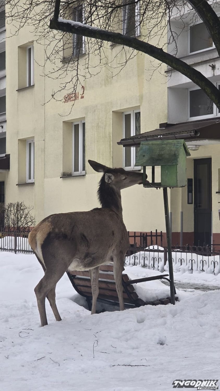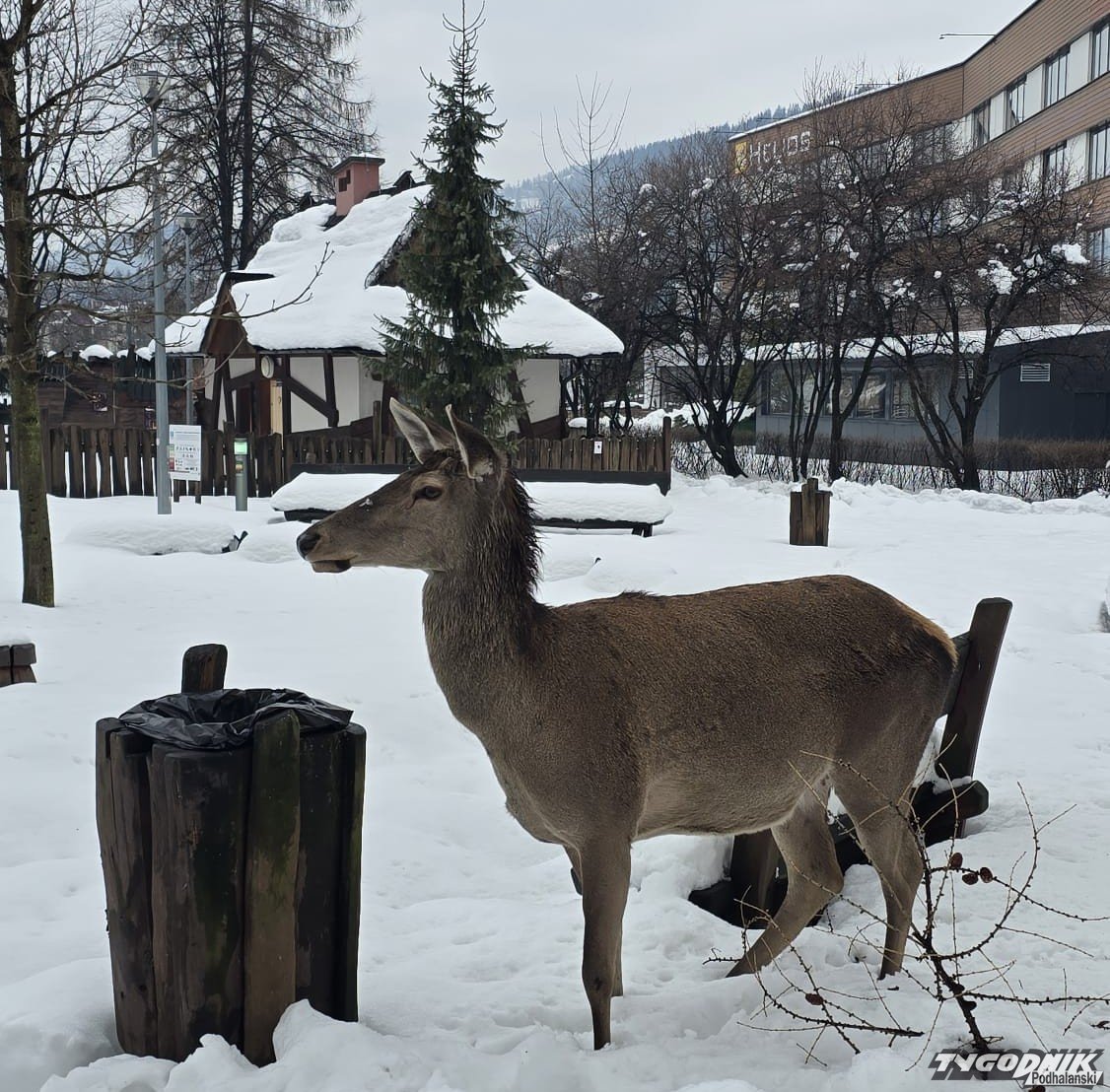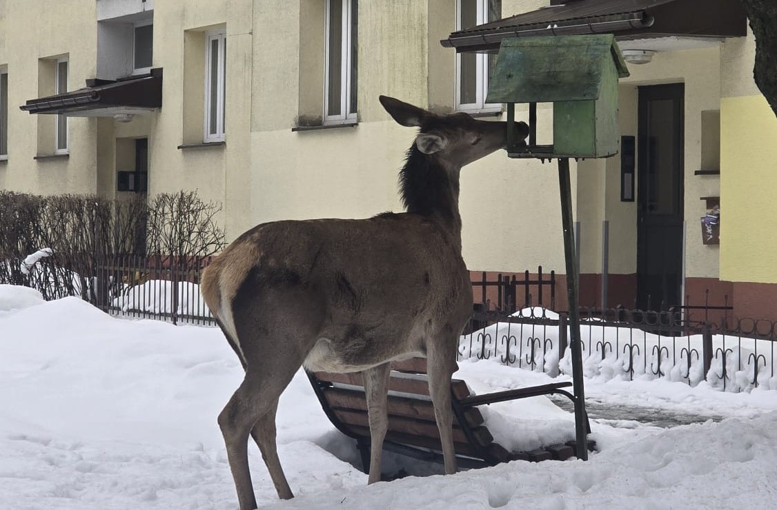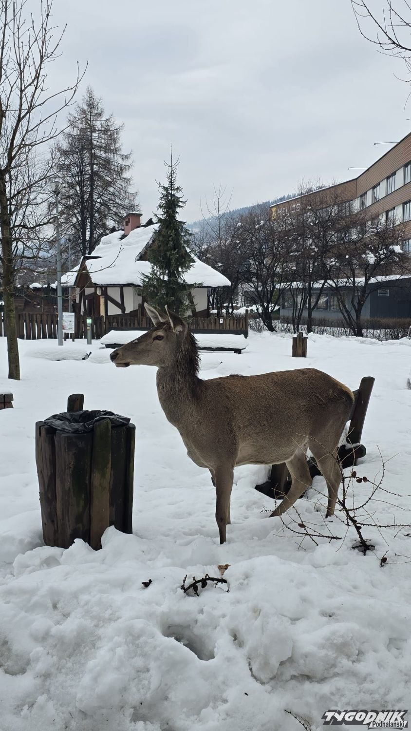 Gruba pokrywa śnieżna utrudnia zwierzętom dostęp do naturalnego pożywienia. W centrum Zakopanego zauważyliśmy łanię, która próbowała wygrzebać jedzenie z kosza na śmieci i nie tylko.
