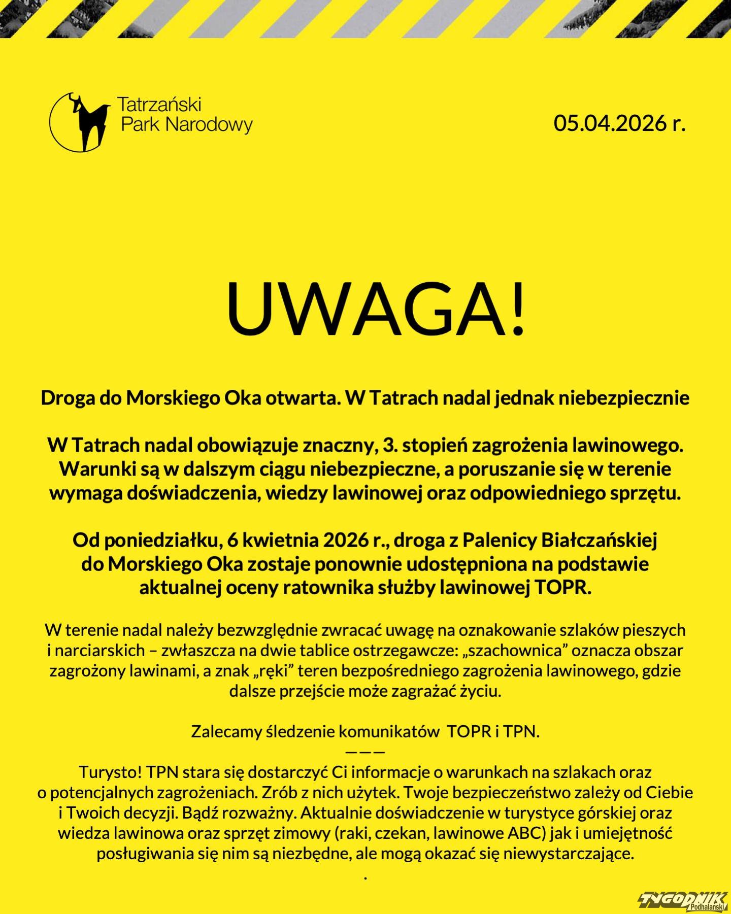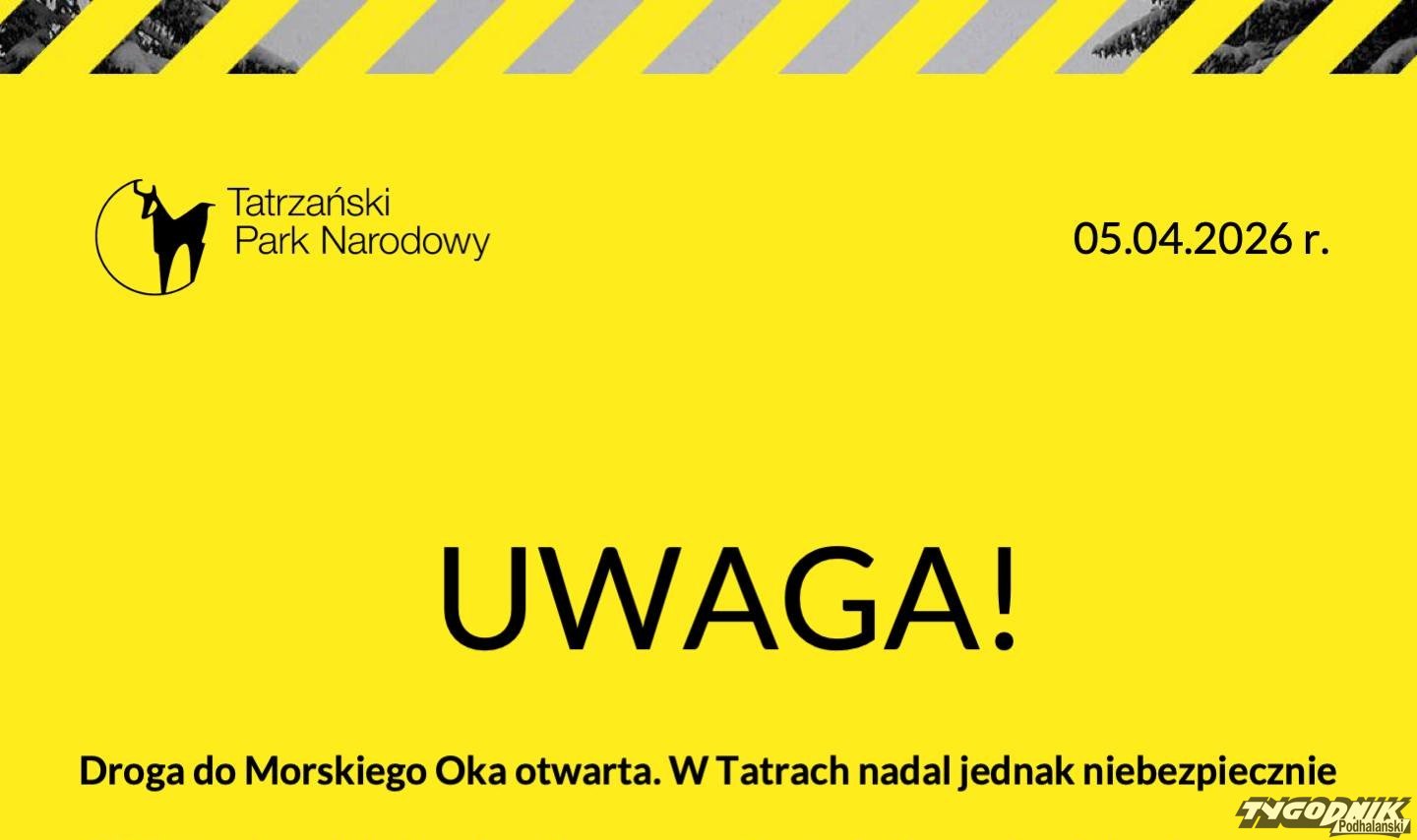 Od poniedziałku turyści ponownie mogą korzystać z drogi z Palenicy Białczańskiej do Morskiego Oka. Tatrzański Park Narodowy ostrzega jednak, że w górach wciąż panują niebezpieczne warunki, a zagrożenie lawinowe pozostaje na wysokim, trzecim stopniu.