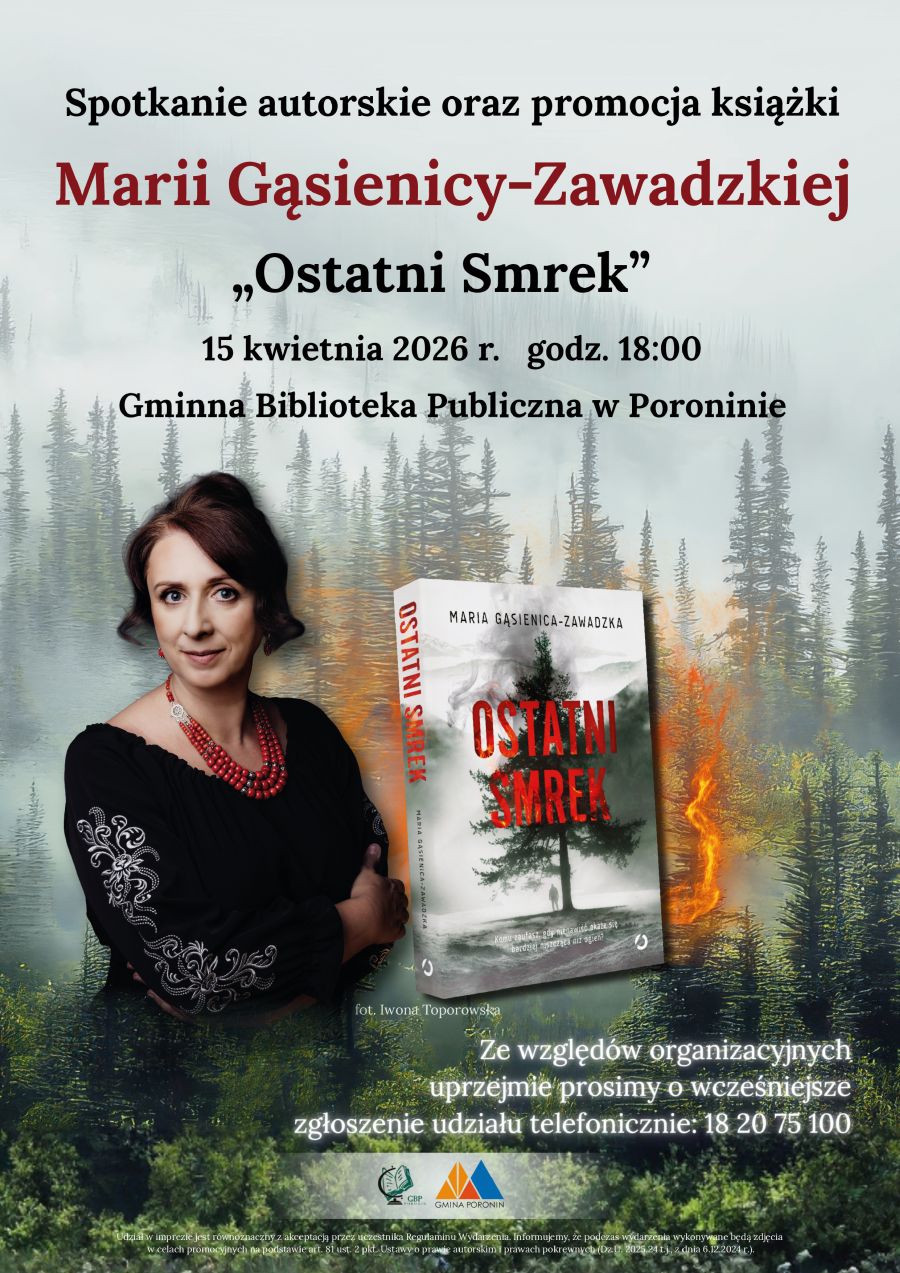 W środę 15.04 w Gminnej Bibliotece Publicznej w Poroninie odbędzie się spotkanie autorskie z Marią Gąsienicą-Zawadzką, połączone z promocją jej najnowszej książki "Ostatni Smrek".