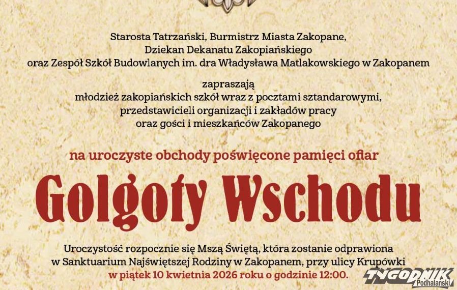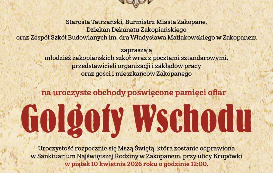 Starosta Tatrzański, Burmistrz Miasta Zakopane, Dziekan Dekanatu Zakopiańskiego oraz Zespół Szkół Budowlanych im. dra Władysława Matlakowskiego w Zakopanem zapraszają młodzież zakopiańskich szkół wraz z pocztami sztandarowymi, przedstawicieli organizacji i zakładów pracy oraz gości i mieszkańców Zakopanego na uroczyste obchody poświęcone pamięci ofiar Golgoty Wschodu.