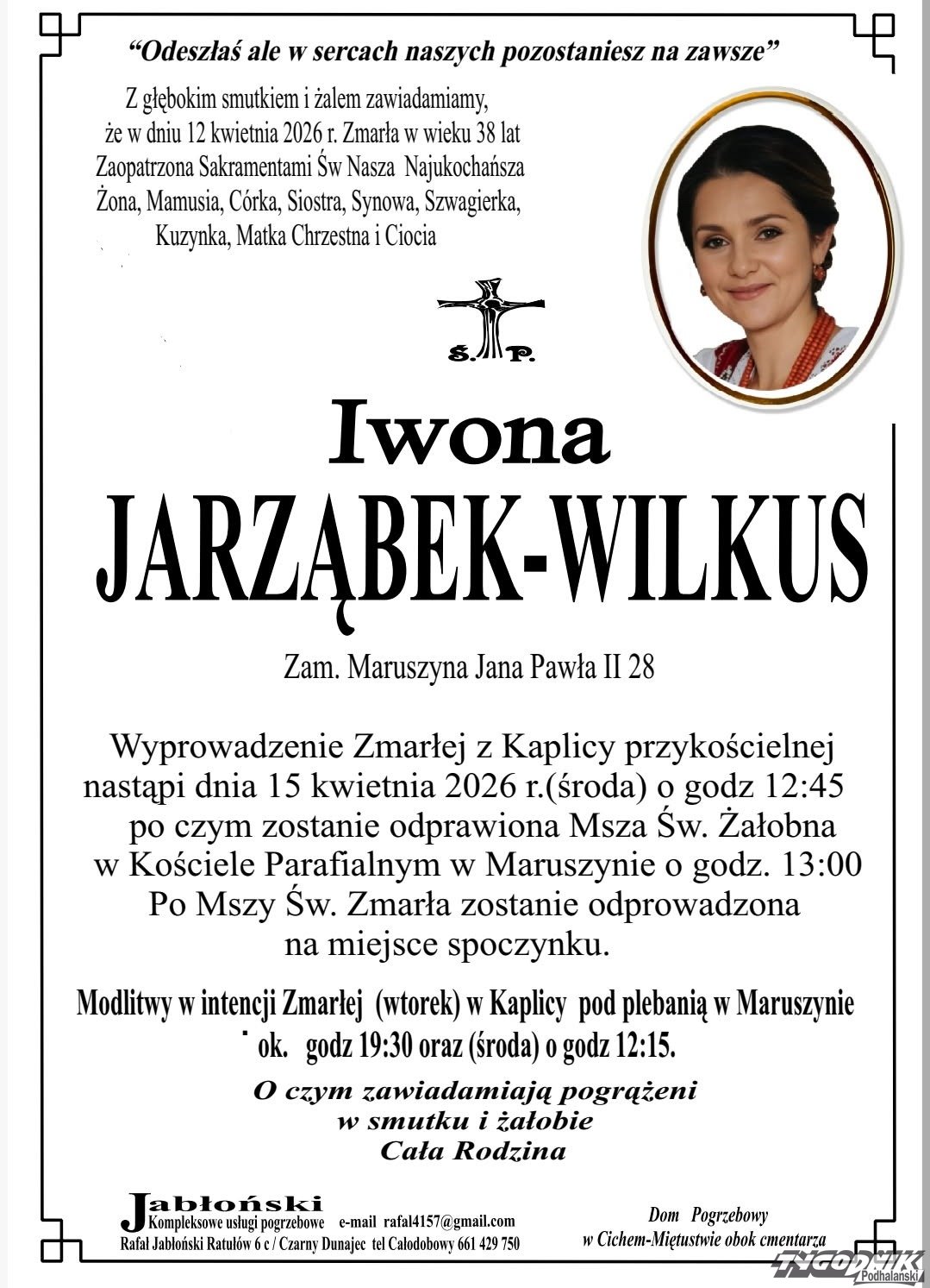 Zmarłą wspominał burmistrz Czarnego Dunajca Marcin Ratułowski. "Z głębokim smutkiem i żalem przyjęliśmy wiadomość o śmierci Śp. Iwonki Jarząbek-Wilkus, żony naszego Kolegi Rafała Wilkusa - Dyrektora Gminnego Ośrodka Pomocy Społecznej w Czarnym Dunajcu" - napisał burmistrz na swoim profilu facebookowym.