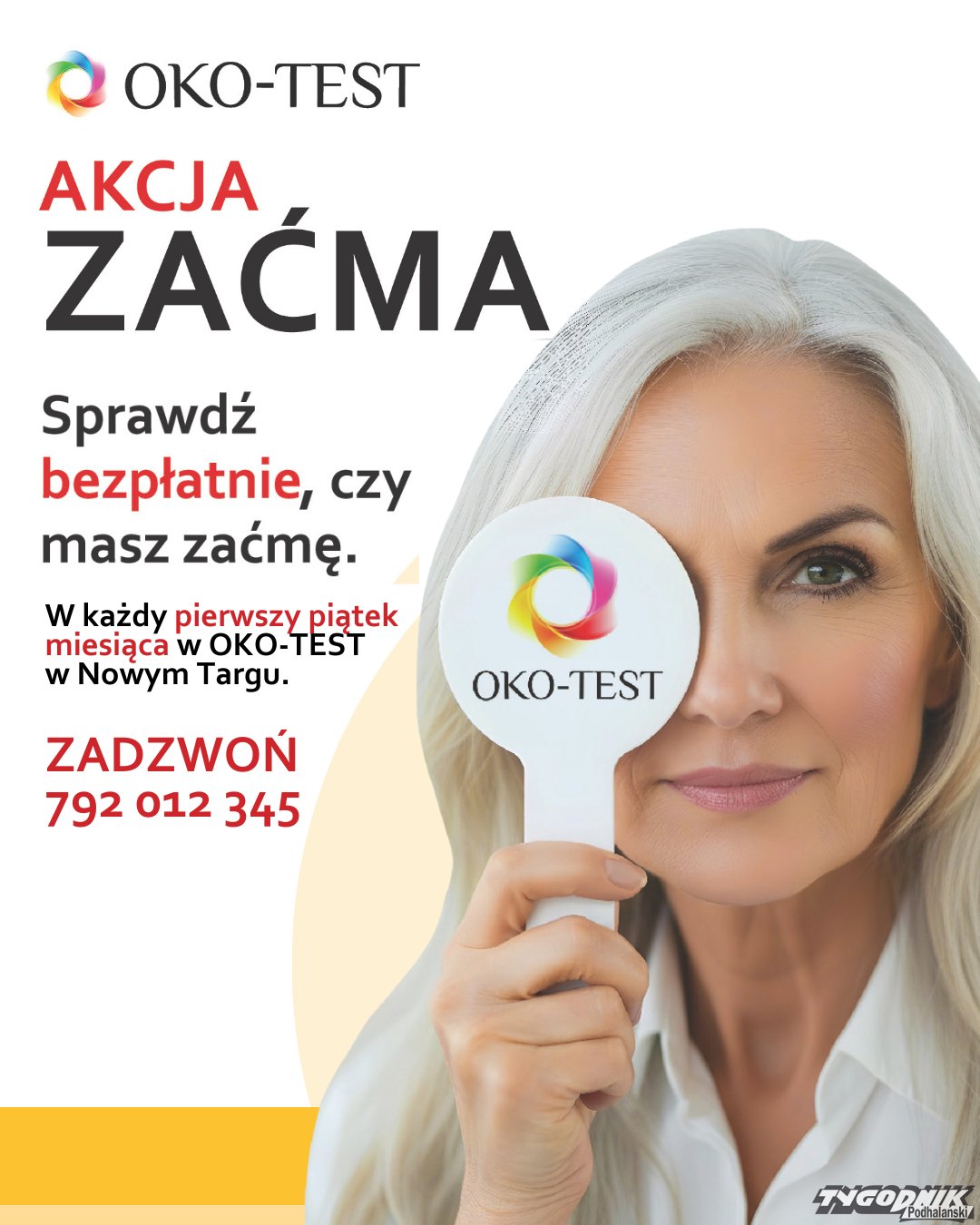 „Akcja zaćma” w OKO-TEST odbywa się w pierwszy piątek każdego miesiąca – kolejna już 8 maja w Poradni Okulistycznej OKO-TEST os. Polana Szaflarska 6 w Nowym Targu. Badania są proste, szybkie i bezbolesne. Wystarczy zadzwonić i się zapisać.