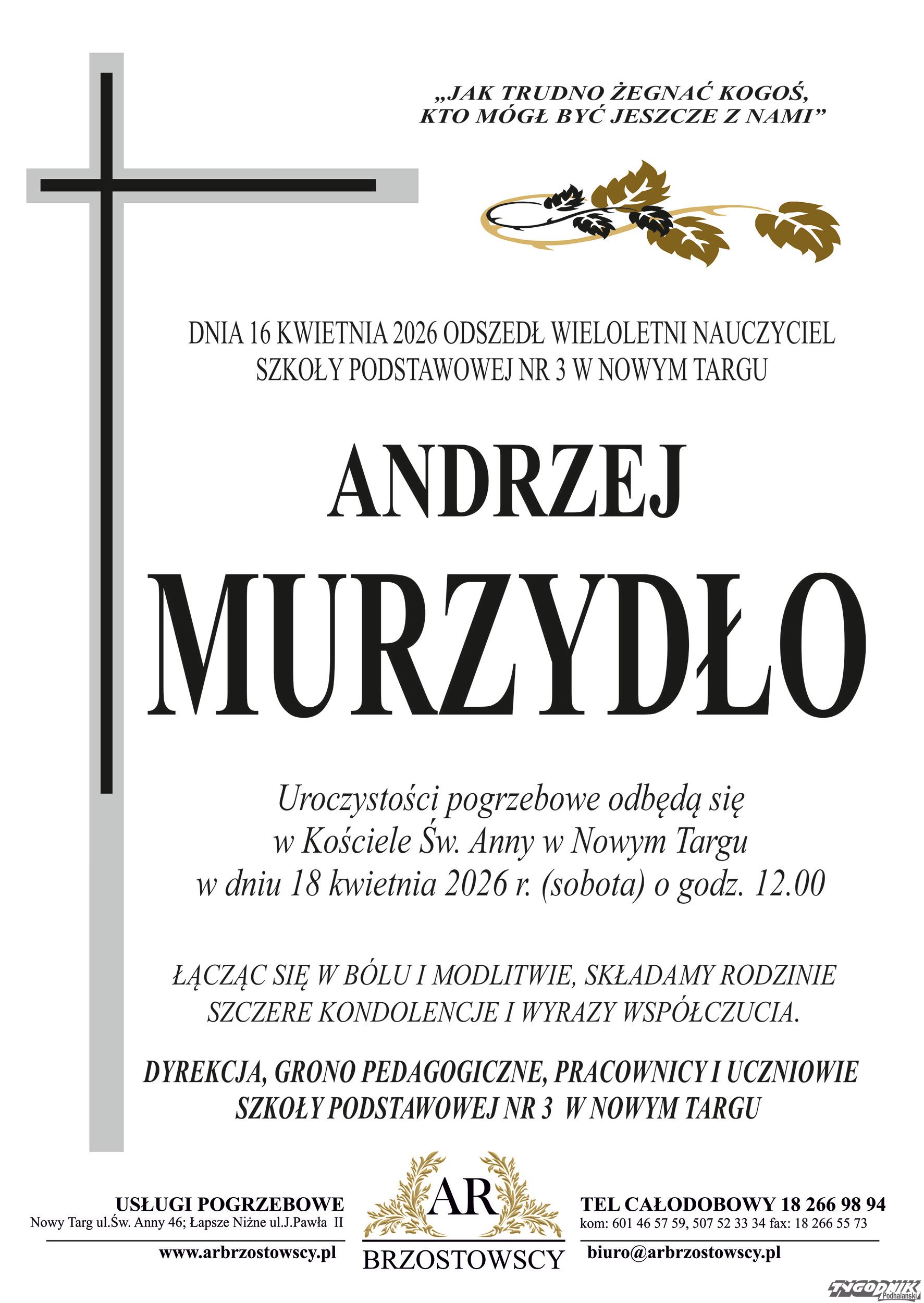 Andrzej Murzydło miał 63 lata. Przez wiele lat był nauczycielem Szkoły Podstawowej nr 3 w NowymTargu. Grono pedagogiczne, pracownicy, uczniowie składają rodzinie zmarłego kondolencje i wyrazy współczucia. Zmarły pracował też jako wychowawca w Prewentorium Kolejowym w Nowym Targu na Kowańcu. Był przyjacielem dzieci - czytamy w nekrologu przygotowanym przez koleżanki i kolegów z grona pedagogicznego Prewentorium.