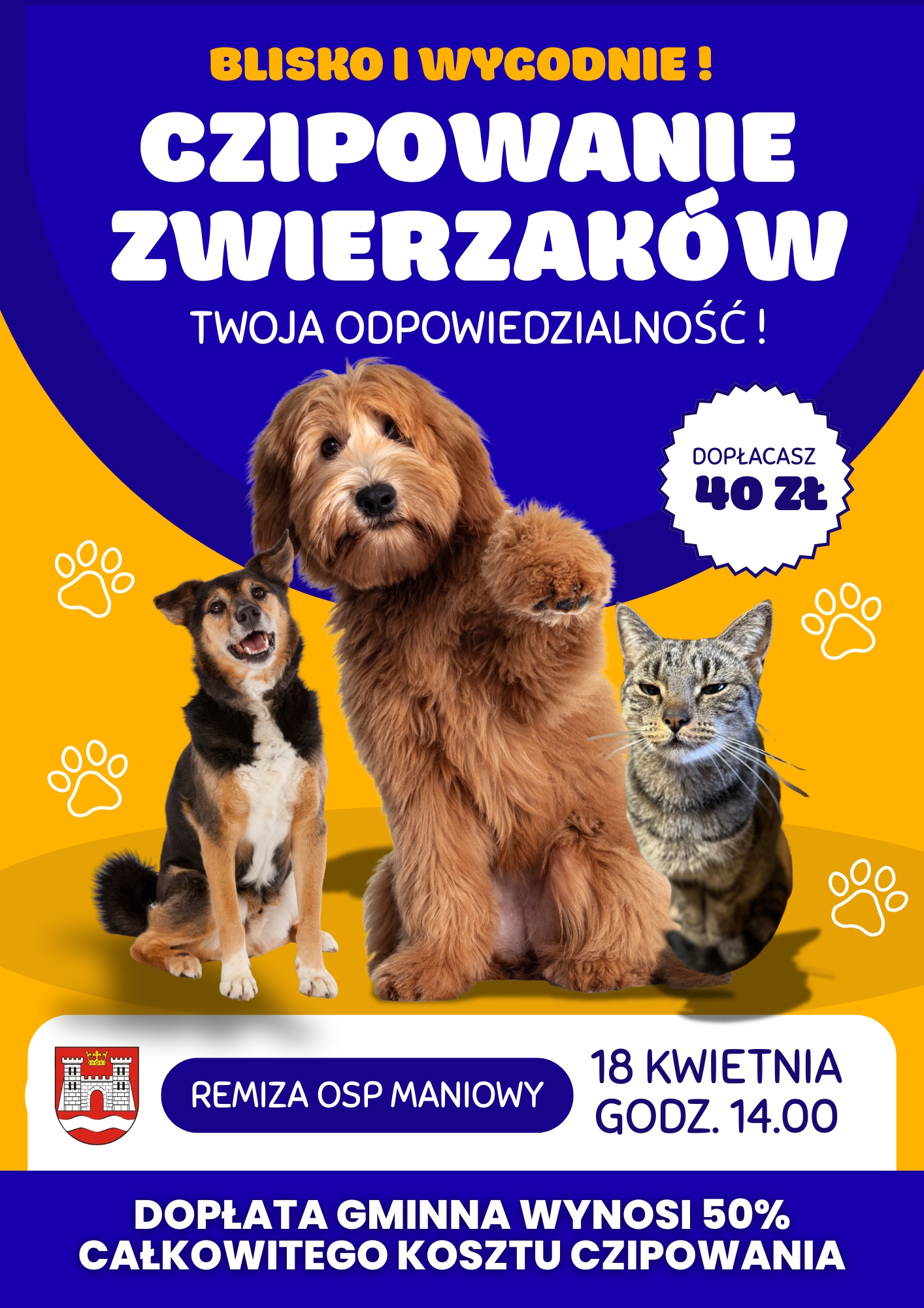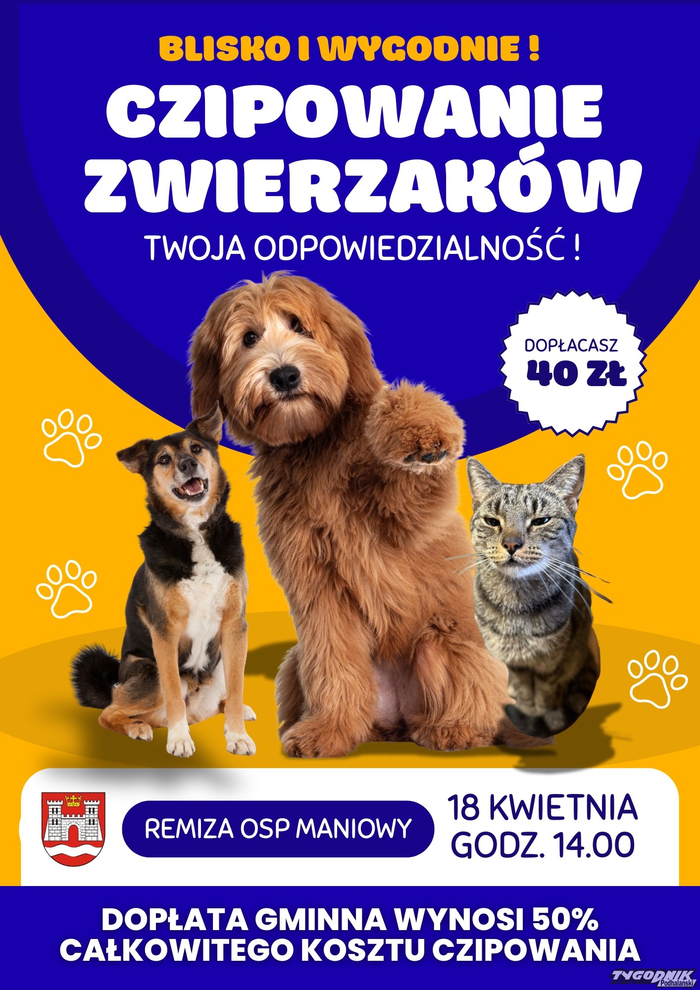 W sobotę, 18 kwietnia, w remizie OSP w Maniowach odbędzie się akcja znakowania psów i kotów. Dzięki dofinansowaniu samorządu mieszkańcy gminy Czorsztyn zapłacą za czipowanie tylko 40 zł. Organizatorzy podkreślają, że mikroczip zwiększa szansę na szybkie odnalezienie zwierzęcia w przypadku jego zaginięcia.