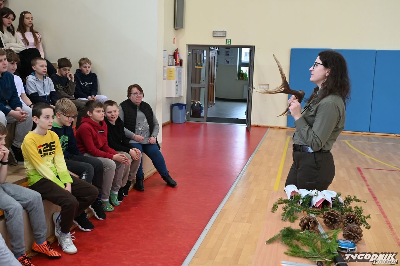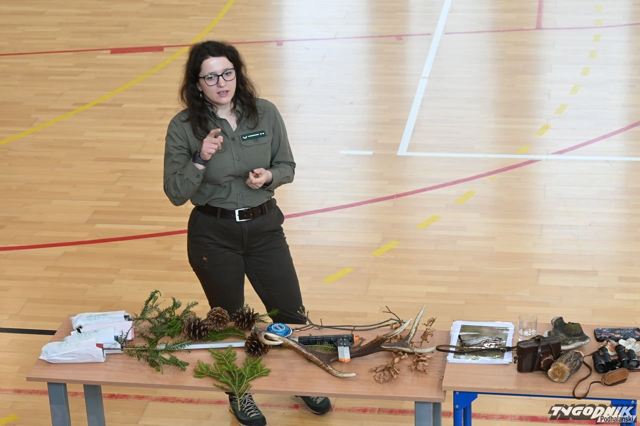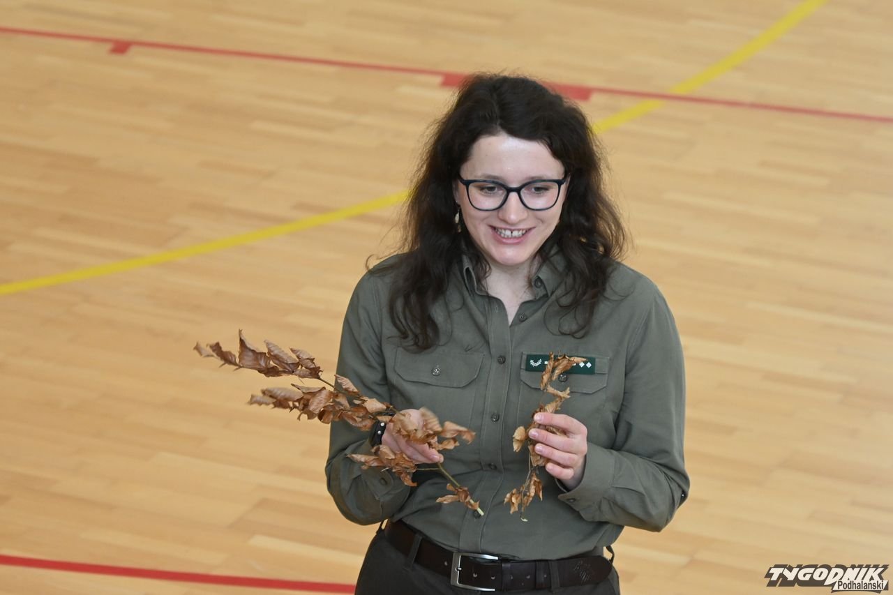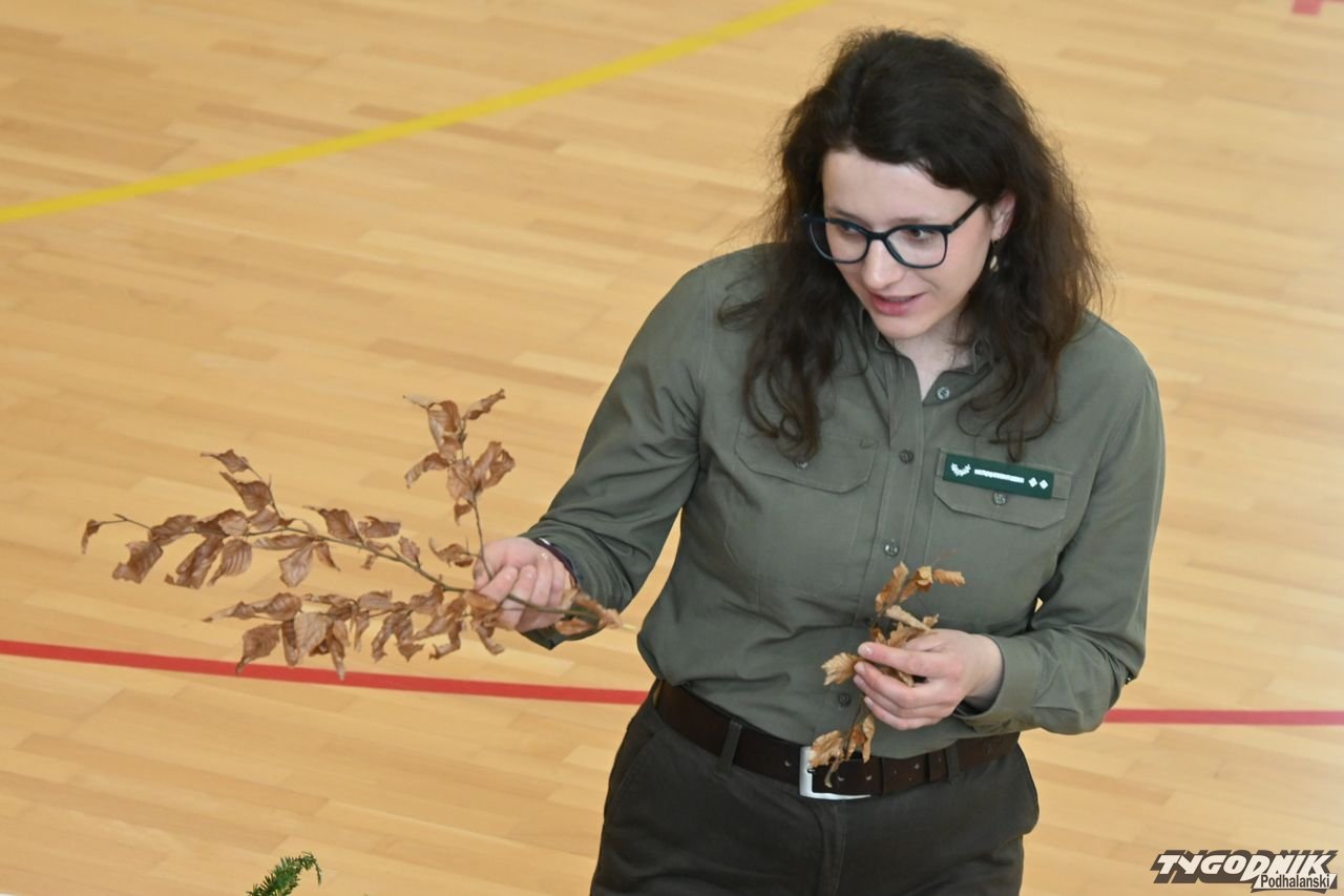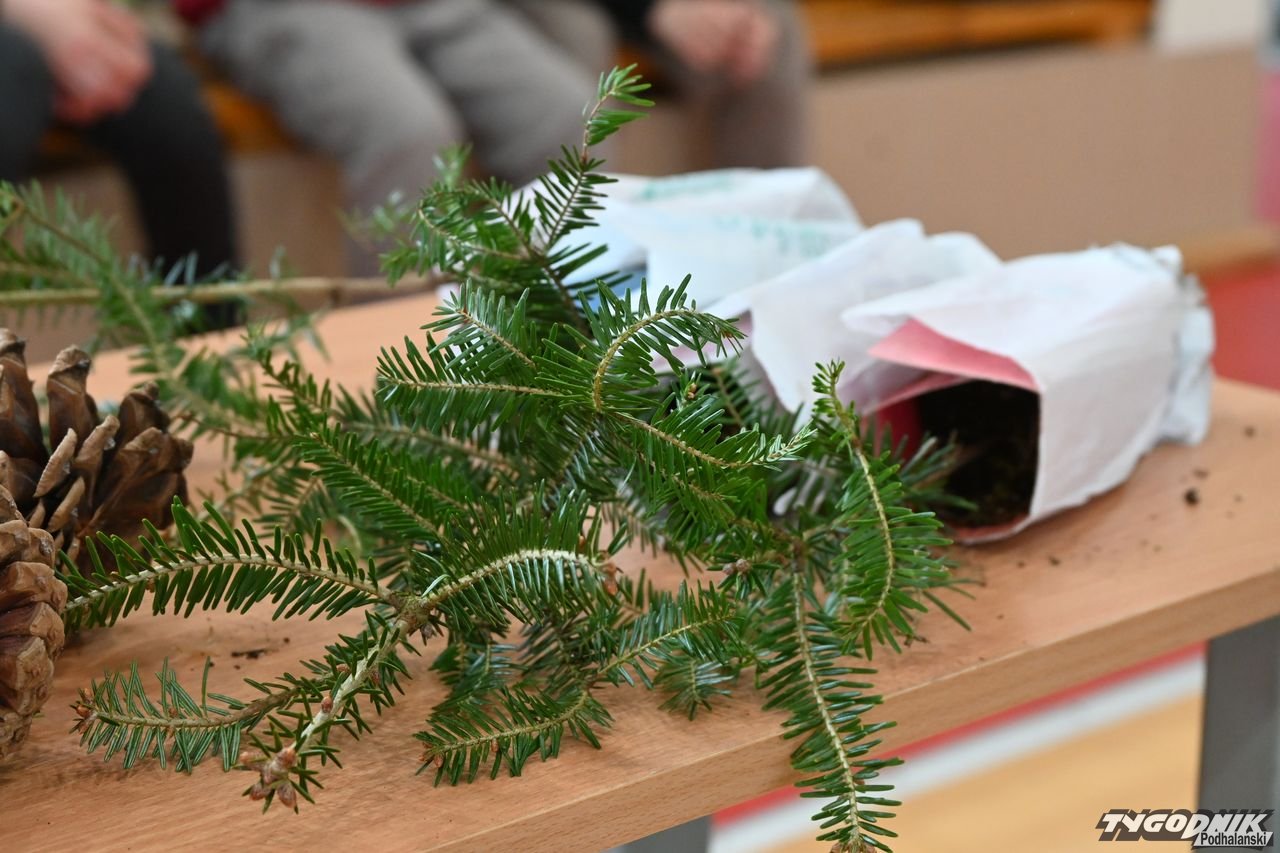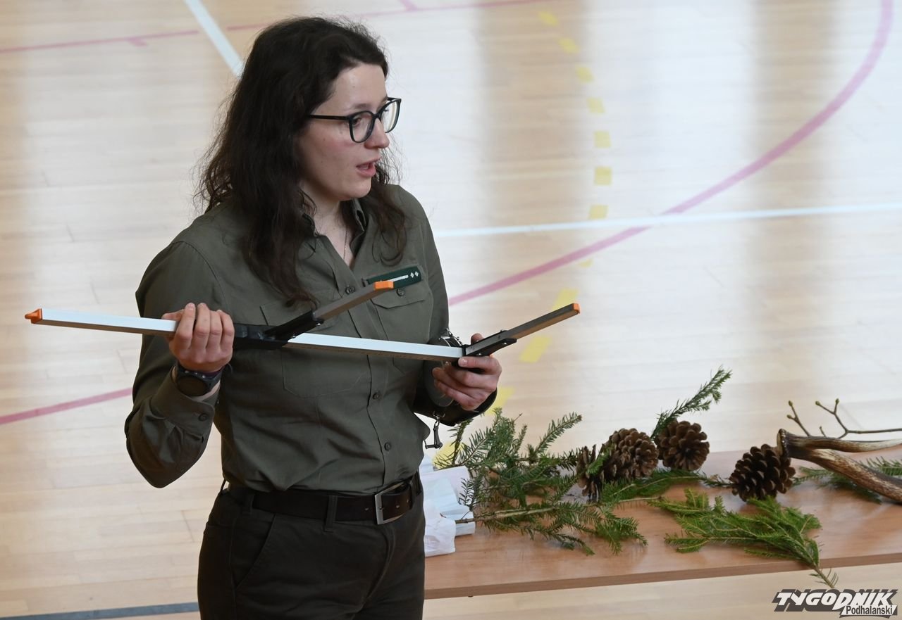 Dorota Galica z Lasów Państwowych - Nadleśnictwa Nowy Targ zaprezentowała uczniom różne sadzonki drzew, które przywiozła ze szkółki leśnej. Opowiadała o pracy leśników. Dzieci miały okazję poznać różne przyrządy do mierzenia drzew, miedzy innymi: klupę (inaczej średnicomierz leśny - narzędzie używane przez leśników, drwali oraz w przemyśle drzewnym do pomiaru średnicy drzew).