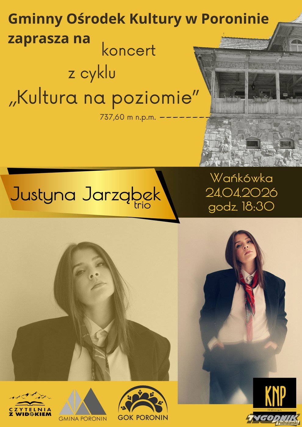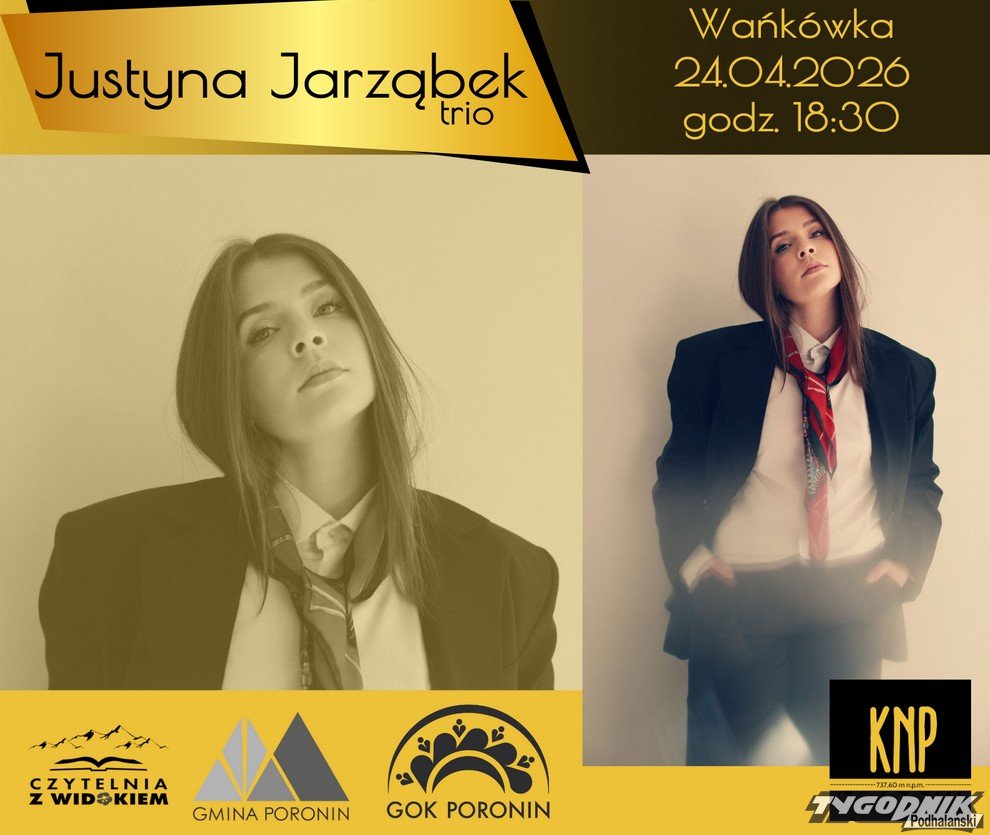Koncert rozpocznie się o godz. 18:30 w Gminnym Ośrodku Kultury w Poroninie. Justyna Jarząbek to utalentowana wokalistka pochodząca z Bańskiej. Już jako siedmiolatka zaczęła grać na skrzypcach i chodzić do szkoły muzycznej. Jest absolwentką wokalistyki estradowej w klasie Mietka Szcześniaka i Ani Szarmach na wydziale Jazzu i Muzyki Rozrywkowej Akademii Muzycznej w Katowicach. Jest uczestniczką telewizyjnego programu "Must be the Music".