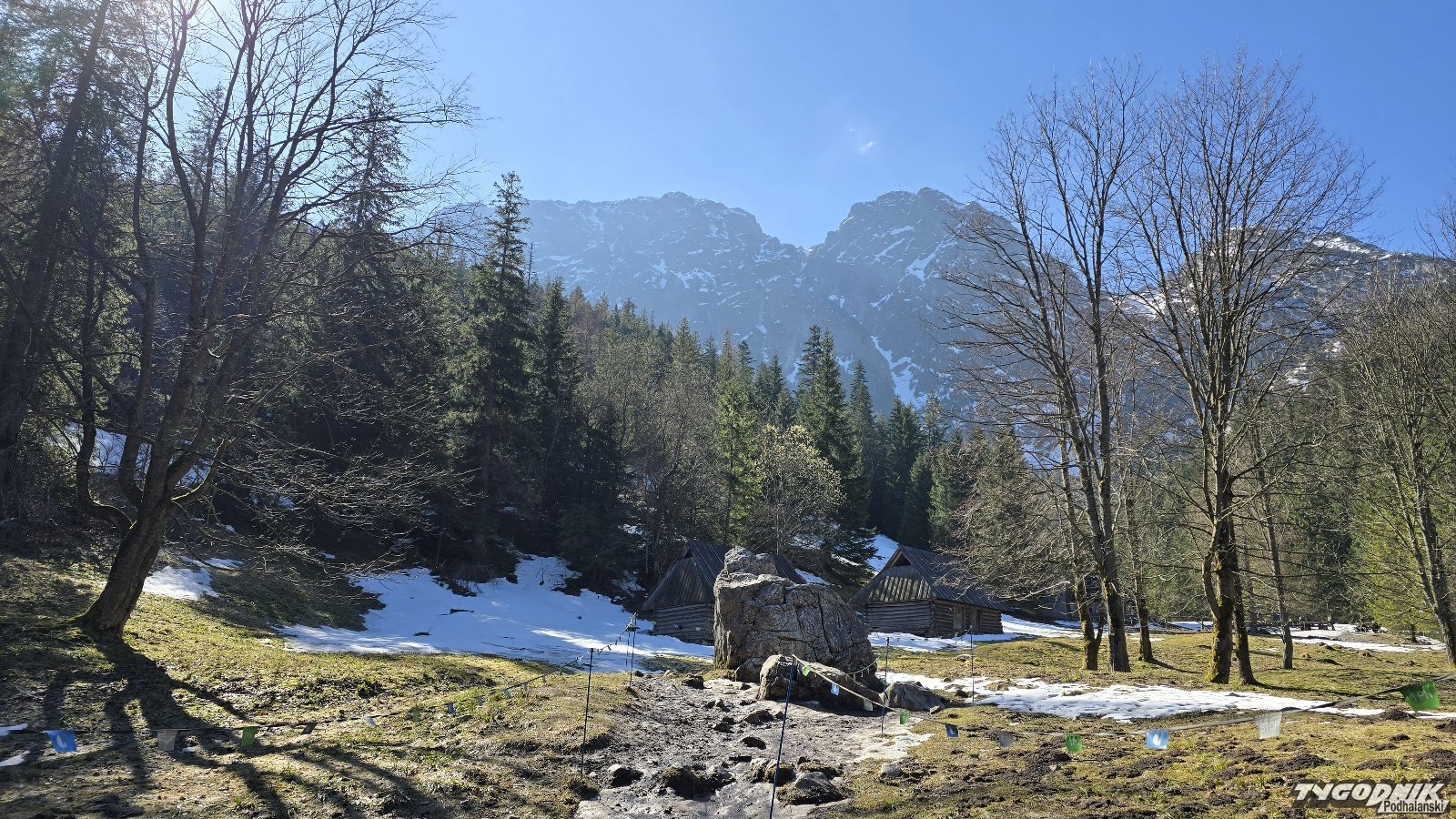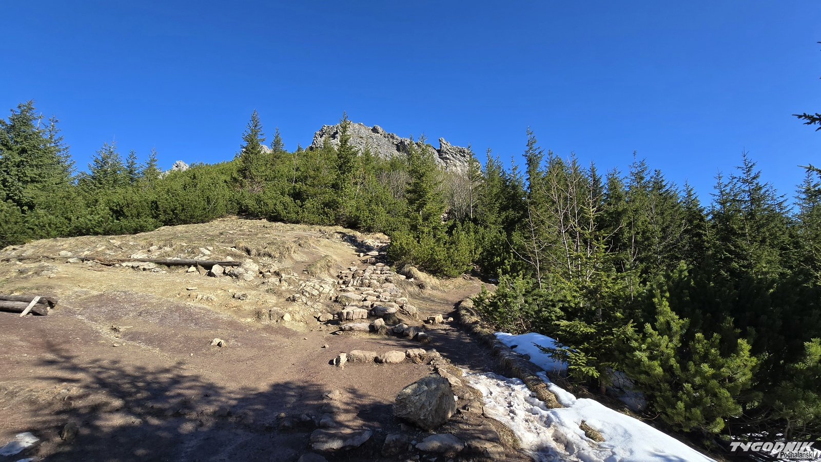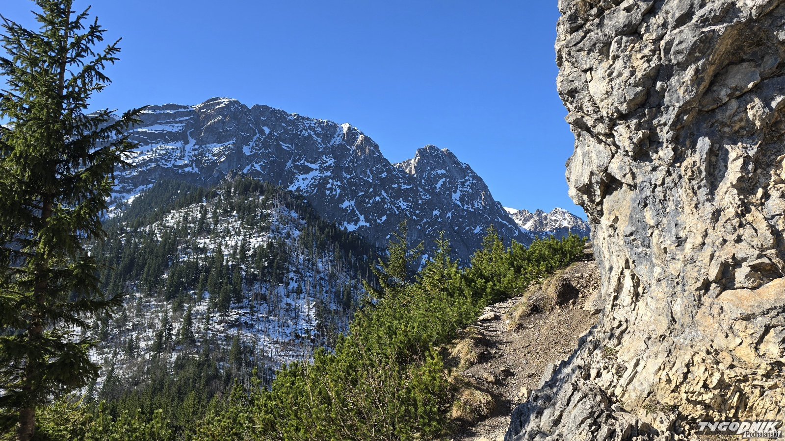 Przed godz. 8 na szlaku w Dolinie Strążyskiej tylko kilka osób, a na Sarniej Skale (1378 metrów n. p. m.) nie było nikogo. O ile przez Dolinę Strążyską da się przejść bez raczków, to już wyżej na Ścieżce nad Reglami po nocnym przymrozku były miejsca mocno zalodzone. Konieczne było używanie raczków. Na samym podejściu na Sarnią Skałę śniegu już nie ma. Widoki z niej przepiękne. Giewont mamy na wyciągnięcie ręki, a w dole pod nami całe Zakopane. Dziś do wieczora słońce. W niedzielę także słoneczny poranek. Pogoda zepsuje się ok. godz. 13-14, kiedy nadciągną chmury i przelotne opady.