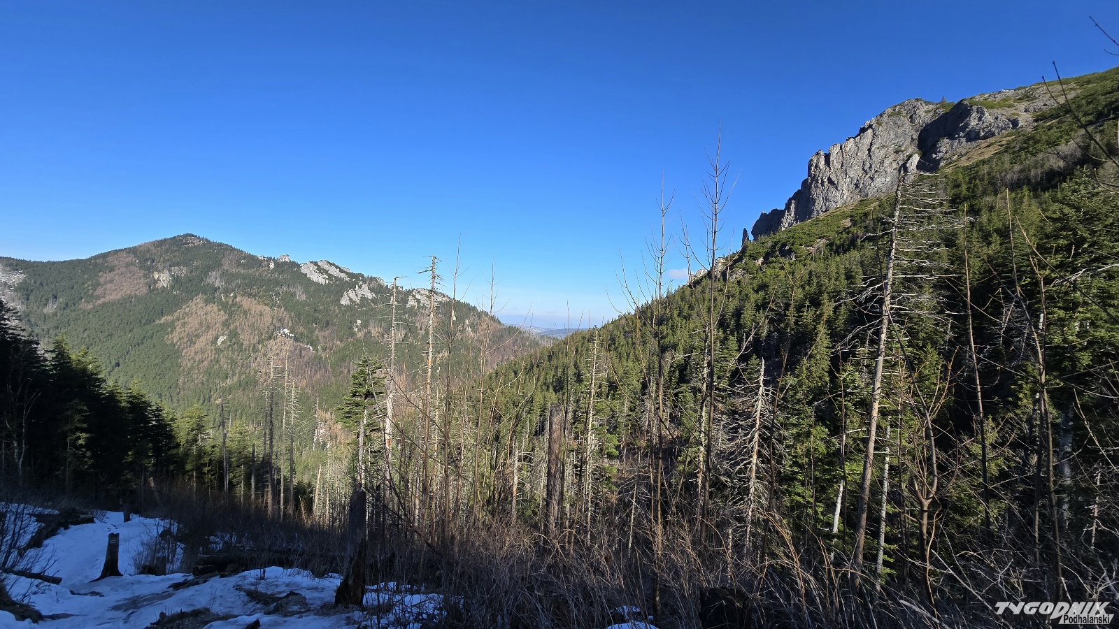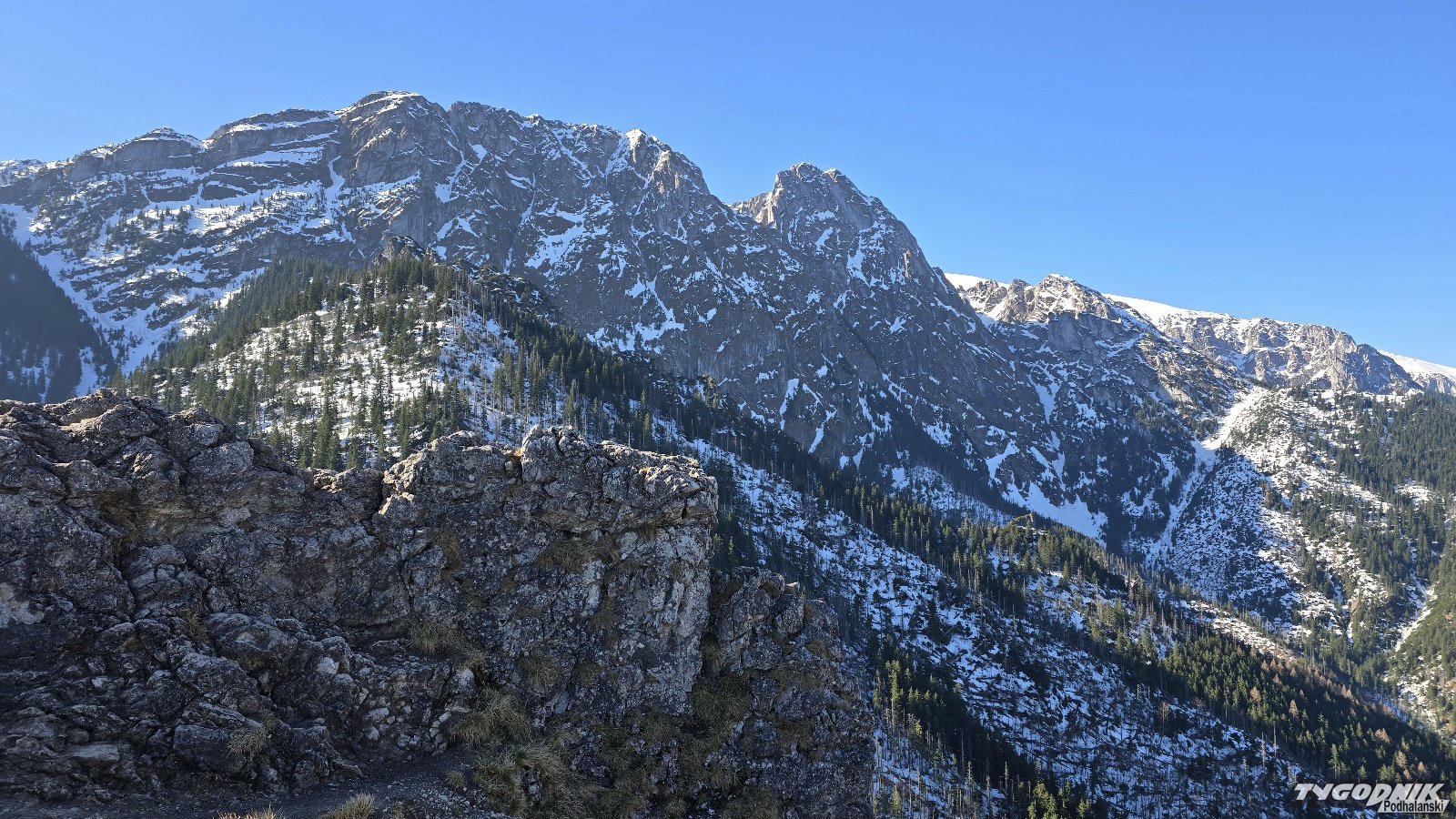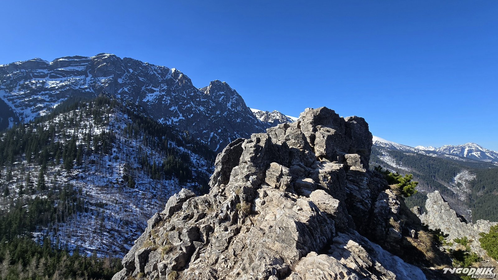 Przed godz. 8 na szlaku w Dolinie Strążyskiej tylko kilka osób, a na Sarniej Skale (1378 metrów n. p. m.) nie było nikogo. O ile przez Dolinę Strążyską da się przejść bez raczków, to już wyżej na Ścieżce nad Reglami po nocnym przymrozku były miejsca mocno zalodzone. Konieczne było używanie raczków. Na samym podejściu na Sarnią Skałę śniegu już nie ma. Widoki z niej przepiękne. Giewont mamy na wyciągnięcie ręki, a w dole pod nami całe Zakopane. Dziś do wieczora słońce. W niedzielę także słoneczny poranek. Pogoda zepsuje się ok. godz. 13-14, kiedy nadciągną chmury i przelotne opady.