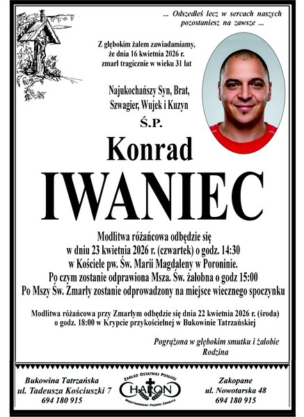 2026-04-20 20:00 Na stadionie lekkoatletycznym przy Orkana trenują prawie sami piłkarze 2026-04-20 19:00 Harda młodość na Krupówkach, czyli co to znaczy być góralem (WIDEO) 1 2026-04-20 18:00 15. Spotkanie ze słowem - Za górala czy za pana? 2026-04-20 17:00 Znamy wyniki Tatrzańskiego Festiwalu Zespołów Góralskich Złote Kierpce 2026-04-20 16:41 Rabkoland otwiera sezon 25 kwietnia. Park rozrywki w Rabce-Zdroju zaprasza na majówkę 2026-04-20 16:30 Utrudnienia na ul. Małej Łąki. Powodem budowa sieci gazowej 2026-04-20 16:17 Wybuch w Maniowach. Relacja strażaków (WIDEO) 2026-04-20 15:28 Awantura w pociągu Gdynia-Zakopane. Nietrzeźwi pasażerowie zatrzymani w Poroninie 2026-04-20 15:07 Wybuch w klubie LKS Lubań Maniowy. Pół budynku zniszczone (WIDEO) 1 2026-04-20 15:00 Kolejny skacowany kierowca stracił dziś prawo jazdy, tym razem w Bukowinie Tatrzańskiej 1 2026-04-20 14:30 Podglądaj, co się dzieje wokół bacówki PTTK na Maciejowej 2026-04-20 14:01 Siatki druciane na wymiar: Zalety personalizowanych rozwiązań przemysłowych 2026-04-20 14:00 Kilkusetmetrowe upadki z dużej wysokości w Tatrach. Ratownicy TOPR mieli pracowitą sobotę 2 2026-04-20 13:30 Trzy groźne oszustki zatrzymane przez nowotarskich policjantów na Śląsku 2 2026-04-20 13:02 Pijany kierowca stracił prawo jazdy, po zakrapianym weekendzie jechał na kacu 7 2026-04-20 12:30 Troje pijanych kierowców zatrzymanych w poniedziałkowe przedpołudnie 1 2026-04-20 12:00 Eksplozja gazu w Skawie 2026-04-20 11:00 Ranny rudzik uratowany przez strażników miejskich z Zakopanego 4 2026-04-20 10:26 Czy jodełka francuska to podłoga odpowiednia do każdego mieszkania? 2026-04-20 10:00 W Tatrach chwycił mróz. Kiedy poprawa pogody? 2026-04-20 09:31 W środę Nowotarski Dzień Ziemi 2026-04-20 09:30 Konflikt o boisko API zakończony? Właściciel rezygnuje. Plan ma być zmieniony na Borach 8 2026-04-20 09:00 Dwa pożary traw w Jabłonce 2 2026-04-20 08:00 Będzie żłobek w Kluszkowcach 3 2026-04-19 21:00 Sztuka, która łączy. Rozmowa z Anną Schumacher 2 2026-04-19 20:00 Młodzież sprząta gminę Poronin, w terenie będzie też więcej jodły, limby i buka 1 2026-04-19 19:44 Poszukiwania polskiego skialpinisty w Tatrach Słowackich 2026-04-19 19:00 "Melodia spod Babiej". Pamięci Eugeniusza Karkoszki 2026-04-19 18:00 System kaucyjny na Podhalu. Pierwsze miesiące, pierwsze opinie. Jakie jest Wasze zdanie? 16 2026-04-19 17:00 "Bliźnioka Harnasia" obejrzycie tym razem w Dzianiszu 2026-04-19 16:31 Wiosna Jazzowa tuż-tuż. Mamy dla Was zaproszenia 1 2026-04-19 15:57 Tatrzański Festiwal Złote Kierpce (ZDJĘCIA) 1 2026-04-19 15:42 Pożar lasu w Bystrej Podhalańskiej 2 2026-04-19 15:05 Odeszła Aniela Krupczyńska, wielka działaczka szczawnicka 2026-04-19 14:26 Słońce, 18 stopni i kolejki po lody 1 2026-04-19 14:00 Podhalańska ekipa na Biegu Nocnym na 10 km w Krakowie 2026-04-19 13:00 Śmieci z widokiem na Giewont 7 2026-04-19 12:00 Szantaż w sieci 3 2026-04-19 11:00 Tatrzański Festiwal Zespołów Góralskich Złote Kierpce (WIDEO) 2026-04-19 10:00 Utrudnienia w ruchu podczas Pieniny Ultra-Trail 2026 w Szczawnicy i Jaworkach 2026-04-19 09:00 Ruszyły zapisy do III edycji turnieju Z Orlika na Stadion 2026-04-18 22:36 Takiego pożaru jeszcze nie było. Paliło się mrowisko 14 2026-04-18 21:06 Spotkanie z Marcinem Wilkiem, pisarzem, badaczem literatury i autorem cenionych biografii 2026-04-18 20:14 To był piękny dzień, również na Bachledzkim Wierchu, ale nadciąga zmiana (WIDEO) 1 2026-04-18 19:31 Józefinka wróciła do Lipnicy Wielkiej. To już prawdziwa oznaka wiosny 2026-04-18 19:00 Więcej pociągów dla Małopolski. Kluczowa inwestycja także dla Podhala 3 2026-04-18 18:00 Gaz płynie! Ratułowski spełnił obietnicę 4 2026-04-18 17:00 Szczawnica znów pobiegnie. Za tydzień startuje Pieniny Ultra-Trail 2026 2026-04-18 16:25 Bocian wrócił na Szymony. Znów zamieszkał w dobrze znanym miejscu 4 2026-04-18 16:09 Wypadek na Zakopiance w Myślenicach. Droga w kierunku Zakopanego zablokowana