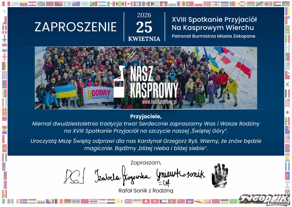 Spotkanie Przyjaciół na Kasprowym Wierchu zaplanowano w tym roku wyjątkowo w sobotę 25.04. Msza na szczycie odbędzie się o 13. Będzie też projekcja filmów archiwalnych, występ chóru Św. Marcina z Klikuszowej, tradycyjne grupowe zdjęcie, poczęstunek i przyjaciół rozmowy.