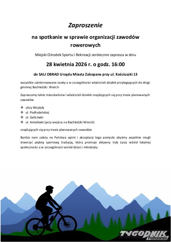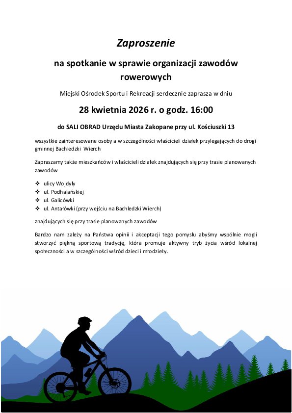 Miejski Ośrodek Sportu i Rekreacji w Zakopanem organizuje spotkanie konsultacyjne dotyczące planowanych zawodów rowerowych. Do udziału zaproszeni są mieszkańcy oraz właściciele działek położonych wzdłuż trasy wydarzenia.