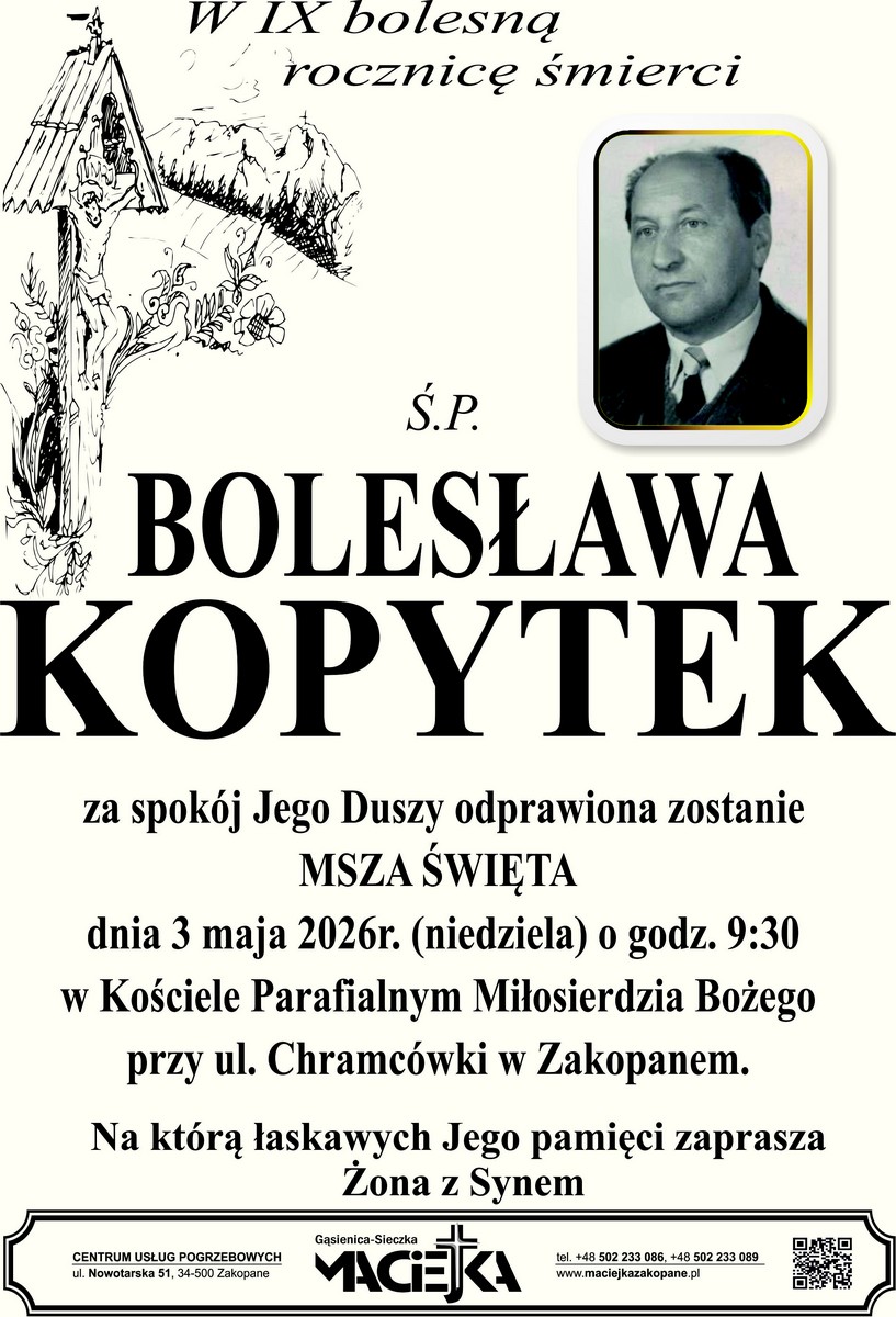 2026-04-23 20:26 680 drzew na 680-lecie Nowego Targu 2026-04-23 20:00 Strażacy ćwiczyli gaszenie pożarów wewnętrznych pod Giewontem 2026-04-23 19:27 Motocykliści zainaugurują sezon w Zakopanem 2026-04-23 18:57 Dwie młode łanie nie przeżyły 2 2026-04-23 18:30 Zakopane otrzymało "niedźwiedziooporne" kontenery 1 2026-04-23 18:00 Spór o plan ogólny w Zakopanem. Radni kłócą się o terminy i informowanie mieszkańców 2026-04-23 16:59 W długi weekend będzie 30 st. C., ale... 2026-04-23 16:37 Zginął poseł Łukasz Litewka. Angażował się w sprawy zwierząt, pisał o schronisku w Nowym Targu 2026-04-23 16:00 Zawody na Bachledzkim Wierchu. Zaproszenie na spotkanie dla właścicieli działek 5 2026-04-23 15:33 Fałszywe prawo jazdy za 2500 euro. Nocna kontrola w Rogoźniku zakończona zatrzymaniem 2 2026-04-23 15:30 W sobotę Spotkanie Przyjaciół na Kasprowym Wierchu 2 2026-04-23 14:59 Pożegnanie płk. Łęckiego. Przepracował 27 lat w Starostwie Tatrzańskim. Wcześniej latał na myśliwcach i szkolił pilotów 2026-04-23 14:01 Wypadek quada w Kościelisku. Poszkodowany trafił do szpitala śmigłowcem LPR 2026-04-23 13:45 Przygotuj rower na ciepłe dni. Skorzystaj z usług serwisu rowerowego 2026-04-23 12:52 Policja podaje szczegóły wypadku na budowie term 13 2026-04-23 12:38 Atak niedźwiedzia w Bieszczadach. Nie żyje kobieta 14 2026-04-23 12:30 Muzykowanie na Duchową nutę rozpocznie się w sobotę 2026-04-23 12:00 Dotacja na przydomowy magazyn energii 2026. Kto może skorzystać i jakie warunki trzeba będzie spełnić 2026-04-23 11:49 Poważny wypadek w trakcie budowy term na Polanie Szymoszkowej (ZDJĘCIA, WIDEO) 2 2026-04-23 11:31 Jak odpowiedni park maszynowy zabezpiecza terminowość robót drogowych? 2026-04-23 11:30 Melodia spod Babiej. Premiera filmu dokumentalnego 2026-04-23 10:59 Gwoździarka pneumatyczna w produkcji mebli 2026-04-23 10:58 Willa Wanda odzyskuje dawny blask w Szczawnicy po latach zapomnienia (WIDEO) 1 2026-04-23 10:00 "Ludyny" Sławosza Smolenia w nowotarskich Jatkach 1 2026-04-23 09:00 Młodzież z Kościeliska włączy się w tworzenie strategii rządowej 2026-04-23 08:00 Wybuch 1 2026-04-22 21:30 Imperial w Zakopanem sprzedany po raz drugi. Tym razem za ponad 30 mln zł 9 2026-04-22 21:00 18 mln zł na zakopiańską "Sokolnię". Umowa podpisana 3 2026-04-22 20:46 Duże stado łani pod Nosalem (WIDEO) 1 2026-04-22 20:30 Ranna wiewiórka znaleziona w Zakopanem. Strażnicy uratowali zwierzę 6 2026-04-22 20:00 Uwaga na fałszywe zwroty podatku. Nowa fala oszustw internetowych 2026-04-22 19:38 Straż Graniczna z leśnikami posadzili tysiąc drzew. Akcja na Dzień Ziemi 5 2026-04-22 18:59 Radni pytają o inwestycje rowerowe, kartę turysty i zawody rowerowe na Bachledzkim 8 2026-04-22 18:30 Po ewakuacji szkoły sprawę pożaru w rozdzielni elektrycznej zbada biegły 2 2026-04-22 18:00 Mieszkańcy Olczy alarmują o zalewaniu posesji i drogi. Każde opady pogarszają sytuację 3 2026-04-22 17:30 W sobotę nowotarska Noc Muzeów 2026-04-22 17:00 Mieszkańcy Wyskówek alarmują: quady i kuligi niszczą spokój i teren. Apel o zdecydowane działania władz 3 2026-04-22 16:25 Niedźwiedzioodporne kontenery w Zakopanem. Nowa inicjatywa dla bezpieczeństwa i przyrody 2026-04-22 16:00 Medale dla tatrzańskich karateków na IKO Przełęcz Cup 2026-04-22 15:30 Street Food Polska Festival ponownie na nowotarskim Rynku 2026-04-22 15:05 Wycinka drzew w rejonie ul. Piłsudskiego i Olimpu. Jest zgoda Nadleśnictwa 1 2026-04-22 14:41 Recydywista włamał się do lokalu gastronomicznego. Grozi mu 15 lat więzienia 2026-04-22 14:00 Nowotarski Dzień Ziemi na rynku. Mieszkańcy świętują i uczą się ekologii 2026-04-22 13:30 Tomasz Wolak Rock Band zagra w Zakopanem 2026-04-22 13:18 Ewakuacja. Zadymienie szkoły w Kościelisku (WIDEO) 2026-04-22 13:02 Konferencja stylistek paznokci na Podhalu. Branża spotkała się w Zaskalu 2026-04-22 12:30 Wpadli na gorącym uczynku. Monitoring i czujność pracowników zadziałały 1 2026-04-22 12:16 Niebezpieczna plama na drogach w Zakopanem. Interweniowali strażacy 2026-04-22 11:58 Niepokojące zmiany w potoku Cicha Woda w Zakopanem. Mętna woda budzi obawy mieszkańców 6 2026-04-22 10:59 Spięcie radnych. "Sodoma i gomora" kontra "bociany przynoszące dzieci" 12