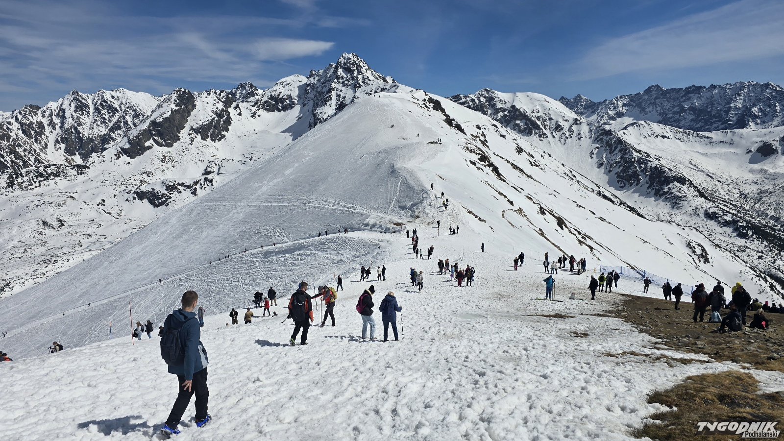Od rana pogoda w Tatrach zachwycała. Nie było nawet silnego wiatr. W Zakopanem temperatura w cieniu wzrosła do prawie 17 st. C., a na Kasprowym do 4. Mimo mszy na szczycie i pięknej pogody nie było kolejek do wjazdu na Kasprowy. Trzeba pamiętać, że w Tatrach panują wciąż zimowe warunki. Powyżej górnej granicy lasu obowiązuje pierwszy stopień zagrożenia lawinowego. Niżej zagrożenia lawinami już nie ma. Pokrywa śniegu na Kasprowym Wierchu wynosiła w sobotę rano 120 cm.