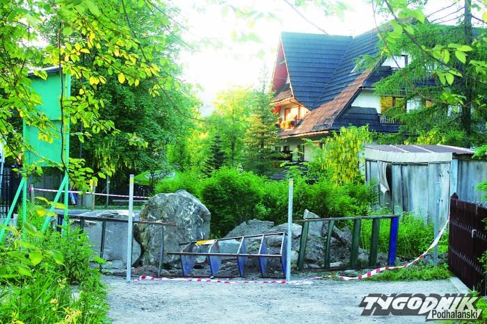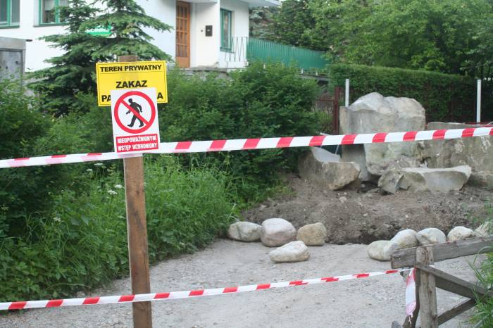 Ciężki sprzęt pracował przy Tetmajera przez sobotę. Przepust rozebrano, betonowe kręgi leżą na brzegu Czarnego Potoku. Na szutrowej nawierzchni po obu stronach wody stoją zacementowane słupki. Do nich zostały przywiązane taśmy i oznakowanie, że to teren prywatny i przejścia nie ma. Dodatkowo potężne, wielotonowe głazy i rumowisko zrobione z metalowych części, popękanych betonowych konstrukcji.