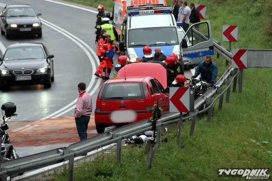 Na miejsce przyjechała karetka pogotowia, policja i straż pożarna. Motocyklista trafił do szpitala.