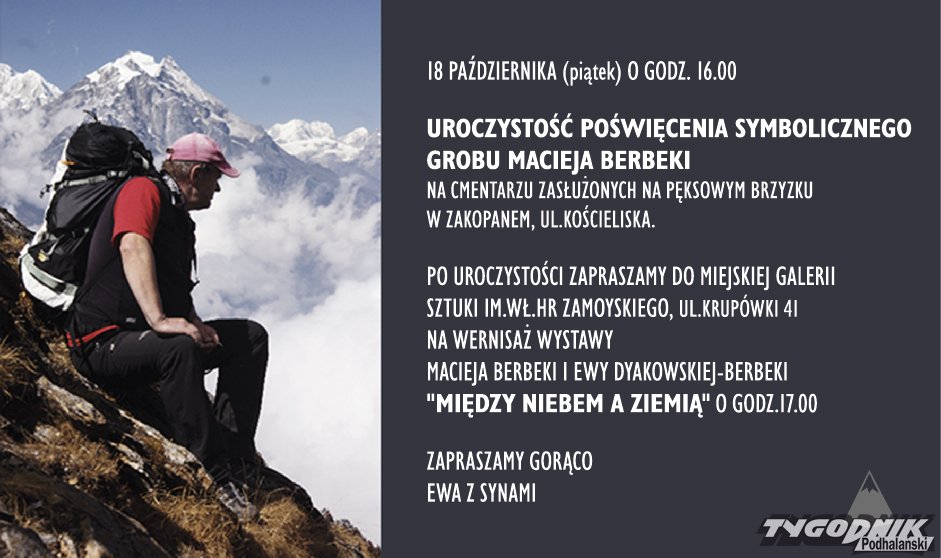 Zakopane pamięta o tragicznie zmarłym w Himalajach Macieju Berbece. W najbliższy piątek jego rodzina zaprasza na uroczystości na Pęksowym Brzysku.