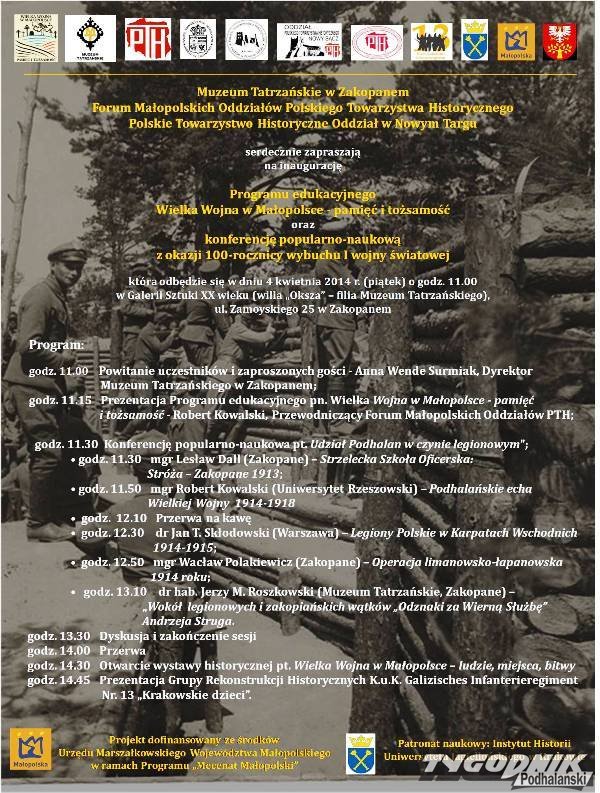 Rusza program edukacyjny na temat I wojny światowej, z okazji setnej rocznicy jej wybuchu, realizowany przez oddziały Polskiego Towarzystwa Historycznego w całej Małopolsce. Jego inauguracja odbędzie się w piątek, 4 kwietnia, w zakopiańskiej filii Muzeum Tatrzańskiego - willi „Oksza” przy ul. Zamojskiego 25.