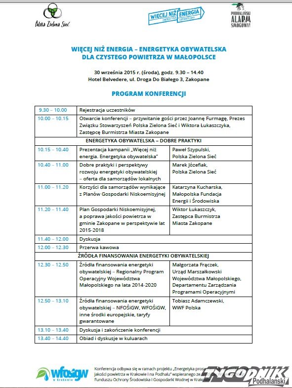 "Więcej niż energia - energetyka obywatelska dla czystego powietrza w Małopolsce" - to temat konferencji, która w środę rozpoczyna się w zakopiańskim hotelu Belvedere. Patronat nad konferencją objął Tygodnik Podhalański.