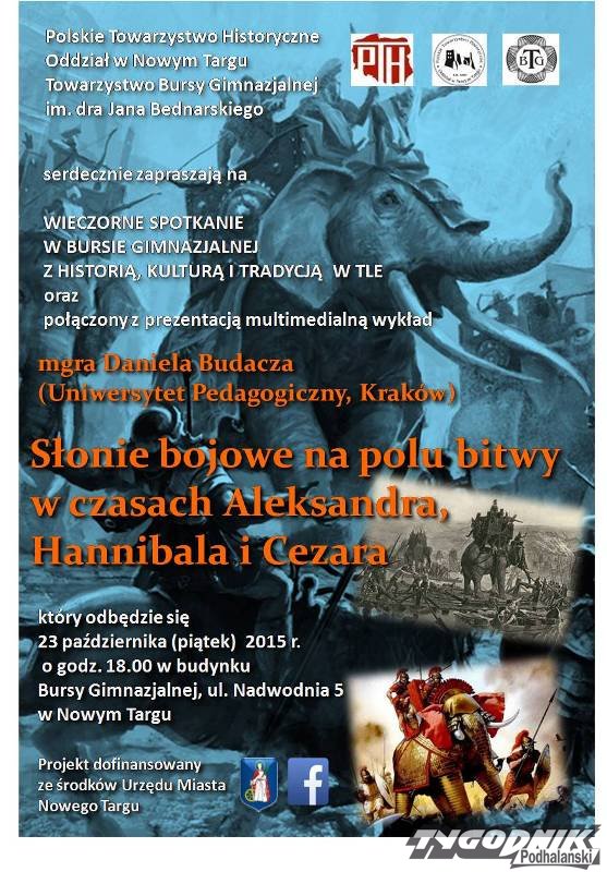 W piątek, 23 października, kolejne spotkanie w nowotarskiej bursie gimnazjalnej. Tym razem z historycznym wykładem pt. „Słonie bojowe na polu bitwy w czasach Aleksandra, Hannibala i Cezara” wystąpi Daniel Budacz z krakowskiego Uniwersytetu Pedagogicznego.