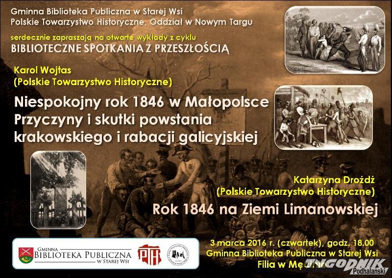Tematem pierwszego wystąpienia będzie sytuacja, jaka panowała w Małopolsce i na Ziemi Limanowskiej w 1846 roku tuż przed wybuchem powstania krakowskiego i rabacji galicyjskiej. Przedstawione zostaną przyczyny tych tragicznych wydarzeń oraz ich skutki dla historii tej części Polski. Nieudane powstanie krakowskie i tragiczna rzeź galicyjska pozostały przez lata w świadomości mieszkańców naszego regionu. Te dramatyczne wydarzenia miały wpływ nie tylko na biografie poszczególnych ich uczestników, ale też na trwale weszły do polskiej kultury, sztuki i literatury np. „Wesele” Stanisława Wyspiańskiego. W referacie ukazane zostaną też nieznane fakty i ciekawostki związane z tymi dramatycznymi wydarzeniami na ziemi limanowskiej.