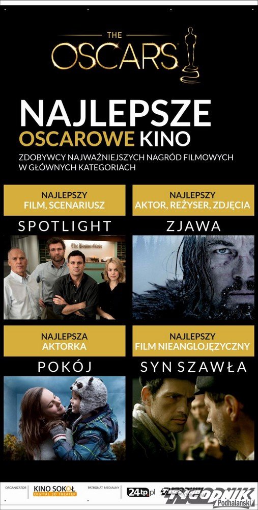 Od piątku 18.03 zakopiańskie kino "Sokół" zaprasza na najlepsze oscarowe filmy. W ciągu tygodnia obejrzymy: "Spotlight", "Zjawę", "Pokój" i "Syna Szawła".