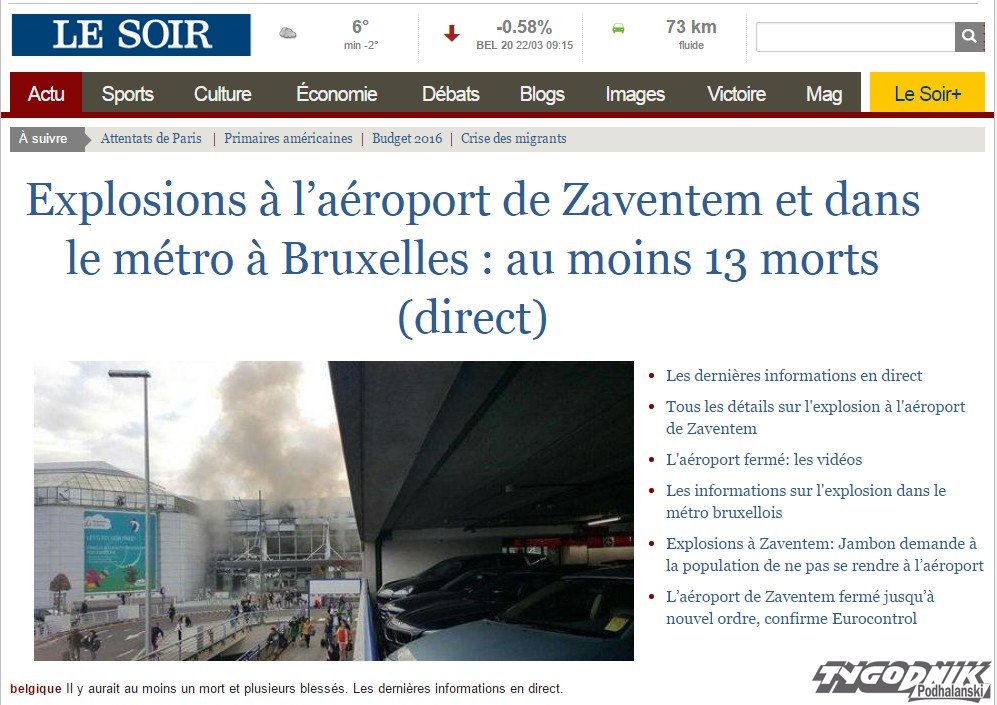 Na lotnisku w Brukseli doszło do dwóch eksplozji, o kolejnych w dwóch wybuchach na stacjach metra donosi Agencja Reuters. Na polskich lotniskach wzmocniono patrole Straży Granicznej.