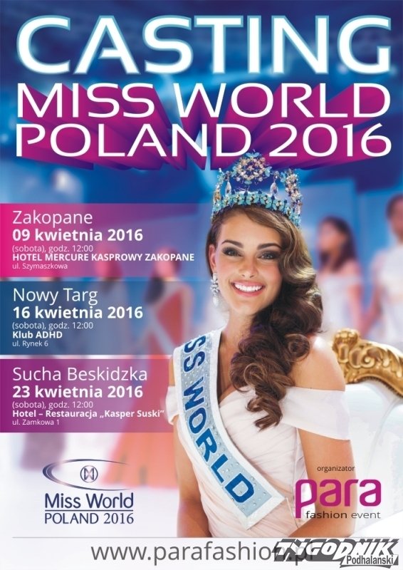 Organizatorem Miss World Poland w naszym regionie jest nowotarska firma PARA Fashion, od ponad dziesięciu lat związana z najstarszym konkursem piękności w Polsce - Miss Polonia. Od roku jej właściciele - Monika Poręba-Strycharz i Piotr Malinowski posiadają licencję na organizację w naszym kraju również rywalizacji w ramach Miss World.
