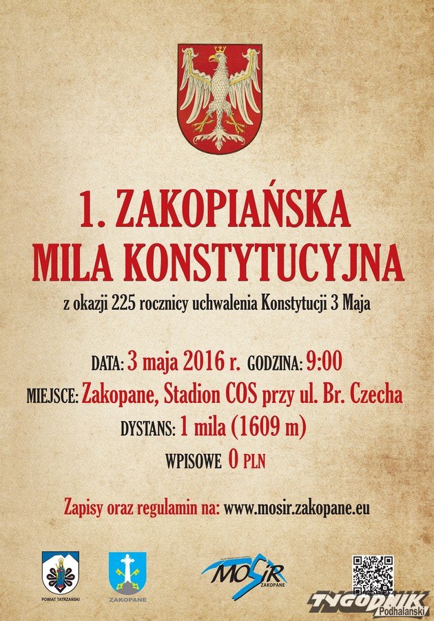 Miejski Ośrodek Sportu i Rekreacji w Zakopanem organizuje 3 maja bieg pod hasłem I Zakopiańska Mila Konstytucyjna.