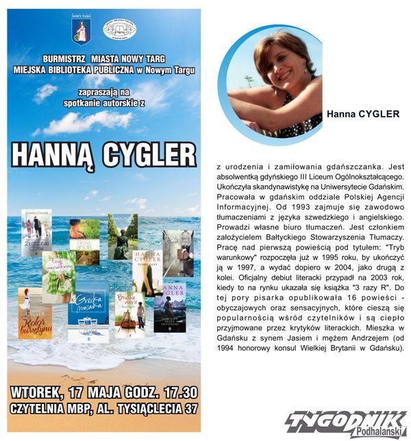 Miejska Biblioteka Publiczna zaprasza w najbliższy wtorek, 17 maja, na spotkanie z pisarką i tłumaczką, autorką kilkunastu powieści obyczajowych i sensacyjnych, Hanną Cygler.