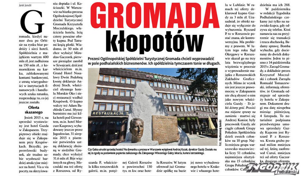 Jesień 2015 r., na sprzedaż wystawiony jest hotel Gazda w Zakopanem. Trzypiętrowy obiekt znajduje się w Zakopanem przy Krupówkach.Brzydki, popeerelowski budynek, ale trudno sobie wyobrazić bardziej atrakcyjne miejsce na taki hotel. Vis a vis poczty, na skrzyżowaniu deptaka i ul.Kościuszki. W Warszawie na biurku prezesa Ogólnokrajowej Spółdzielni Turystycznej Gromada Krzysztofa Moczulskiego, właściciela hotelu, leżą cztery poważne oferty kupna. Pod Tatrami krążą plotki. Wiadomo, że 30 mln zł chce wyłożyć Mirosław Gaczorek, pierwsze pieniądze zarobił w Szwajcarii, dziś jest właścicielem m.in. Grand Hotel Nosalowy Dwór. Podobną kwotę deklaruje Andrzej Stoch, właściciel słynnego hotelu Morskie Oko i sieci restauracji wzdłuż Krupówek. O kupno walczy też Adam Bachleda Curuś. Słynny burmistrz ma już kilka hoteli pod Giewontem, m.in hotel Mercure Kasprowy, wybudowany jeszcze przez Jugosłowian. 31 sierpnia 2015 r. pisemnie potwierdza ustną deklarację złożoną w siedzibie Gromady, chce wyłożyć 31,6 mln zł. Bije więc innych na głowę.Moczulski ma też ofertę z Rzeszowa od Ryszarda P., właściciela kilku rzeszowskich galerii, m.in. potężnej Galerii Rzeszów o powierzchni 130 tys. mkw., oraz hotelu Rzeszów. W lutym oferował już Gromadzie spółkę na bazie jej nowo wybudowanego hotelu w Krakowie i własnego hotelu w Lublinie. W ramach tej oferty deklarował kupno Gazdy za 3 mln zł. Uzasadniał, że obiekt nadaje się wyłącznie do wyburzenia. Ryszard P. to w Rzeszowie postać znana, ale kontrowersyjna. Ma problemy z prawem. W lutym tego roku Sąd Okręgowy w Rzeszowie skazał go na trzy lata bezwzględnego więzienia w procesie o wyprowadzenie majątku z Rzeszowskich Zakładów Graficznych. Mimo że wyrok nie jest jeszcze prawomocny, w Zakopanem nie chcą słyszeć o nim jako nowym właścicielu Gazdy. - To jakiś dziwny gość. Przecież ma niejasne sprawy na karku - martwi się Andrzej Konior, były pracownik Gazdy, ale ciągle członek Grupy Południe. Spółdzielnia dzieli swoich członków na 10 grup. Najliczniejsza grupa warszawsko-mazowiecka liczy 51 członków, najmniejsza olsztyńska ma 15 członków. Grupa Południe to 44 członków.Cała spółdzielnia ma ich 288.