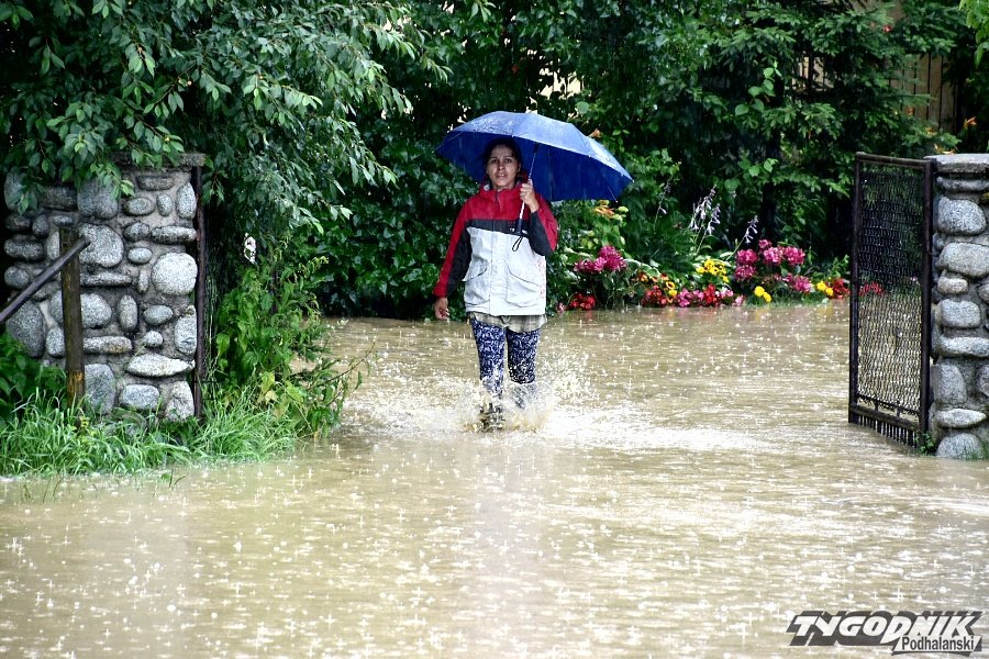 Potok zalewa os. Romskie w Czarnej Górze. Woda wlewa się do piwnic domów.
