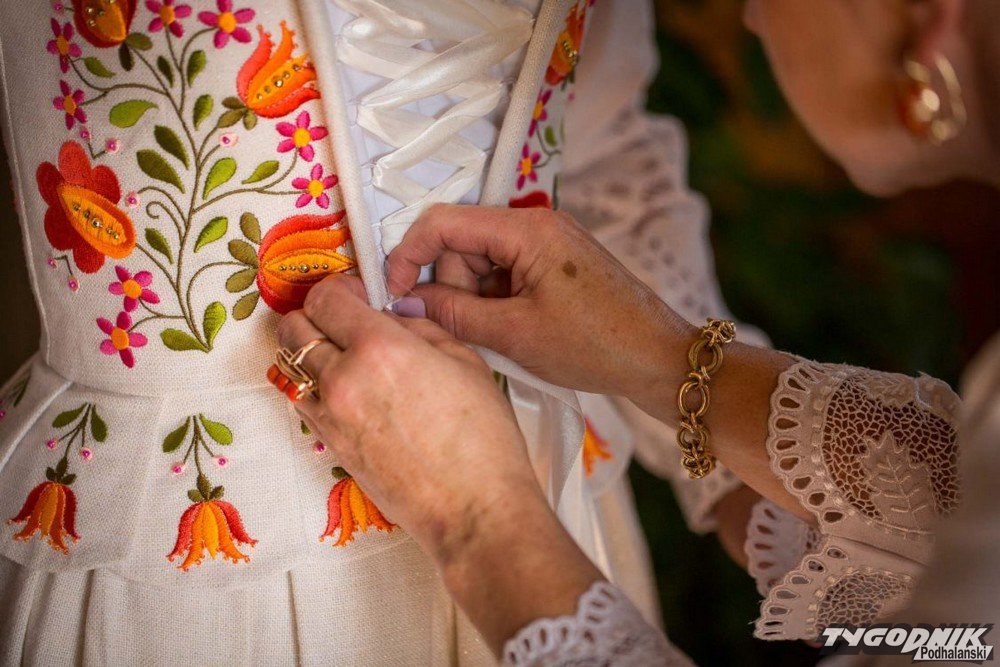 Skoro piszę o przygotowaniach nie może zabraknąć krótkiej wzmianki o ubiorze. Tutaj nie zobaczycie tradycyjnej sukni ślubnej, a prawdziwy strój ludowy, który przetrwał w niezmienionej formie od wielu wieków. Jedynym szaleństwem, na które może pozwolić sobie przyszła Panna Młoda jest wybór zdobień gorsetu, bluzki czy spódnicy, z których składa się ten tradycyjny strój. Wzory zdobiące gorset to motywy kwiatowe zaczerpnięte prosto z górskich rejonów. Strój Karoliny, który widzicie poniżej zdobiony jest cekinami układającymi się w kwiaty.