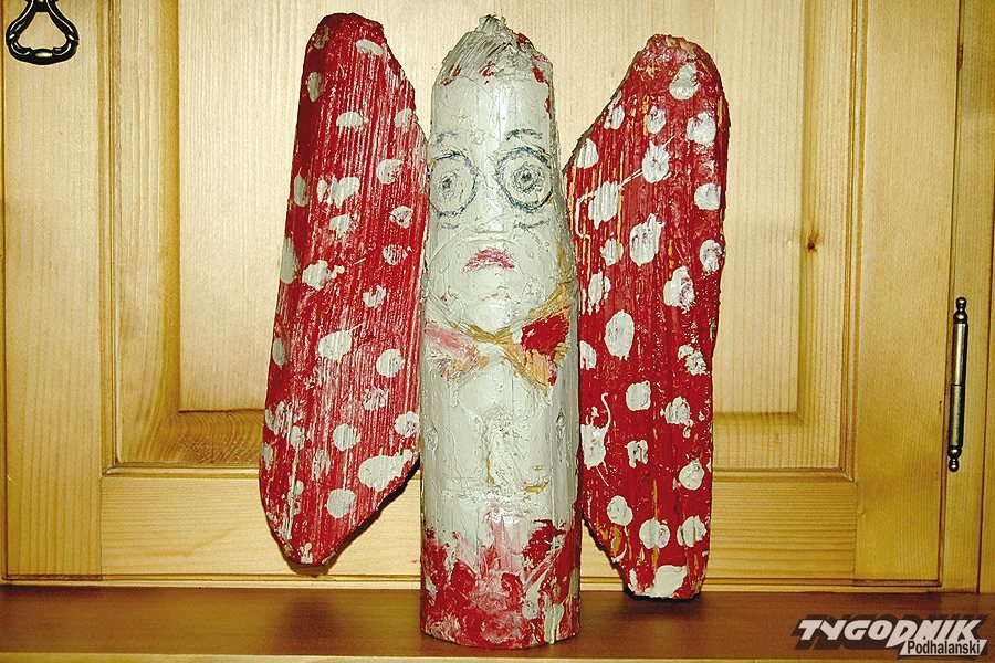 – Czasem do niego zachodziłem. Kiedyś chciałem mu podpowiedzieć, żeby anioły zrobił bardziej radosne, żeby może pomalował je na czerwono. On ze zdumieniem popatrzył na mnie, że śmiem mu coś podpowiadać, i powiedział: „Jak se ty wyobrażasz anioła na czerwono? Na czerwono może być tylko diabeł” – opowiadał pan Emil. Mimo to, gdy miał w zapasie tylko czerwoną farbę, to nią również malował anioły. Skrzydła dorabiał im z gontów. Stawiał je na łące i siadał przy nich. Anioły były jego ulubionym tematem. Twierdził, że one też cierpią. A cierpi ten, któremu namalował czerwoną stróżkę. Archanioły były większe od innych aniołów.