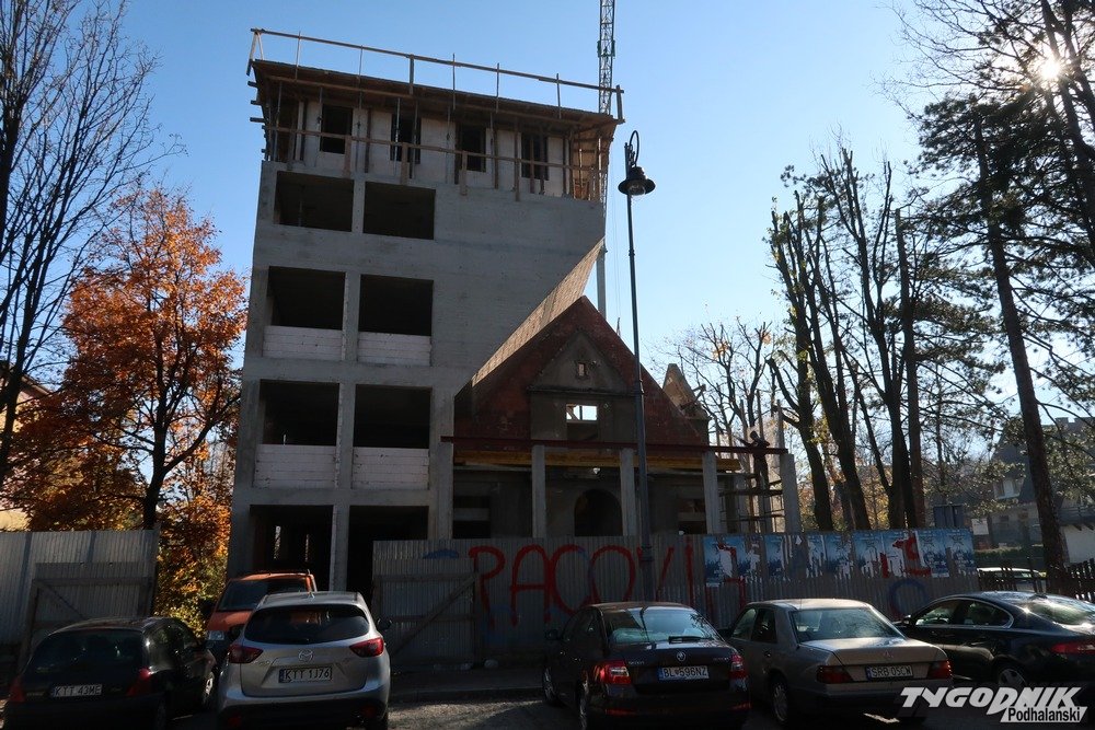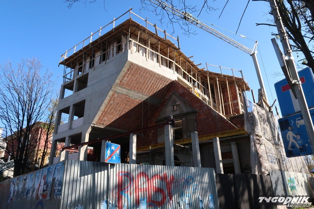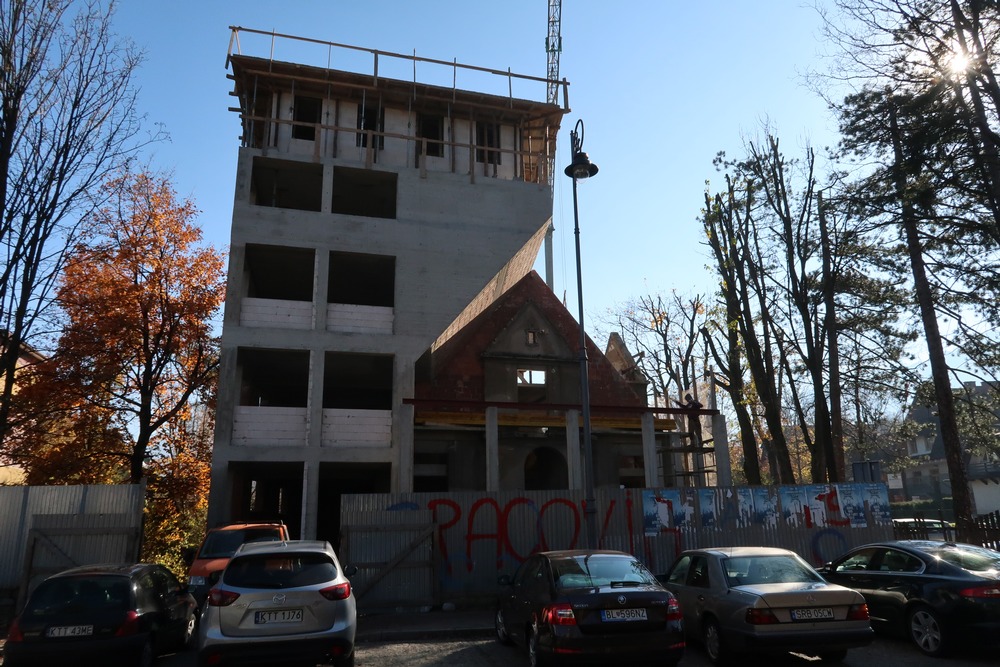 Przypomnijmy - zgodnie z zatwierdzonym projektem, który był uzgodniony z konserwatorem zabytków - ze starej willi pozostały tylko dwie ściany. Pozostała część budynku jest budowana od nowa i teraz kolejne kondygnacje wyrastają wysoko ponad ściany dawnego budynku.