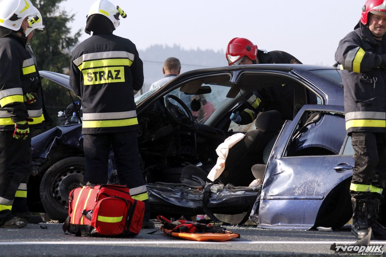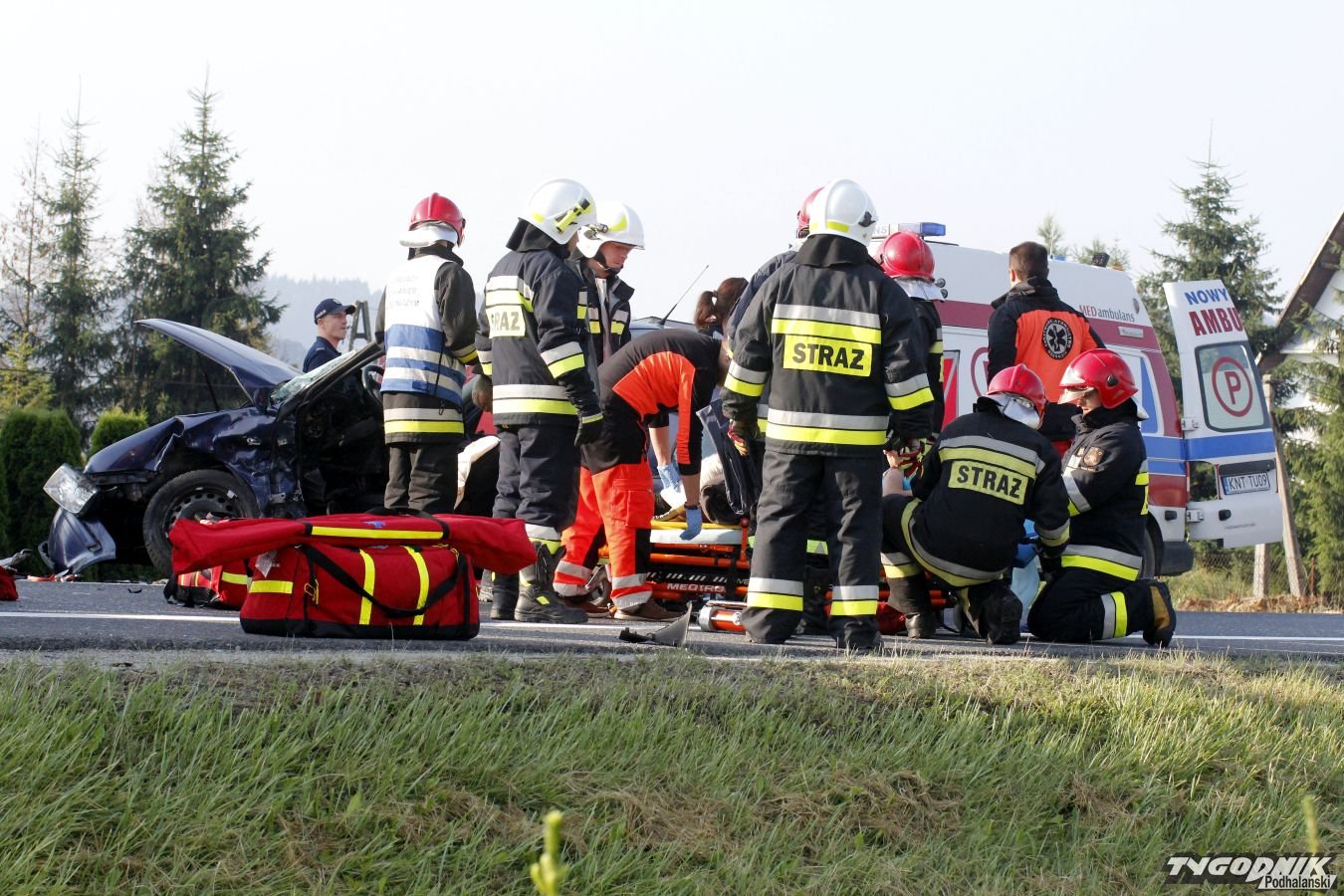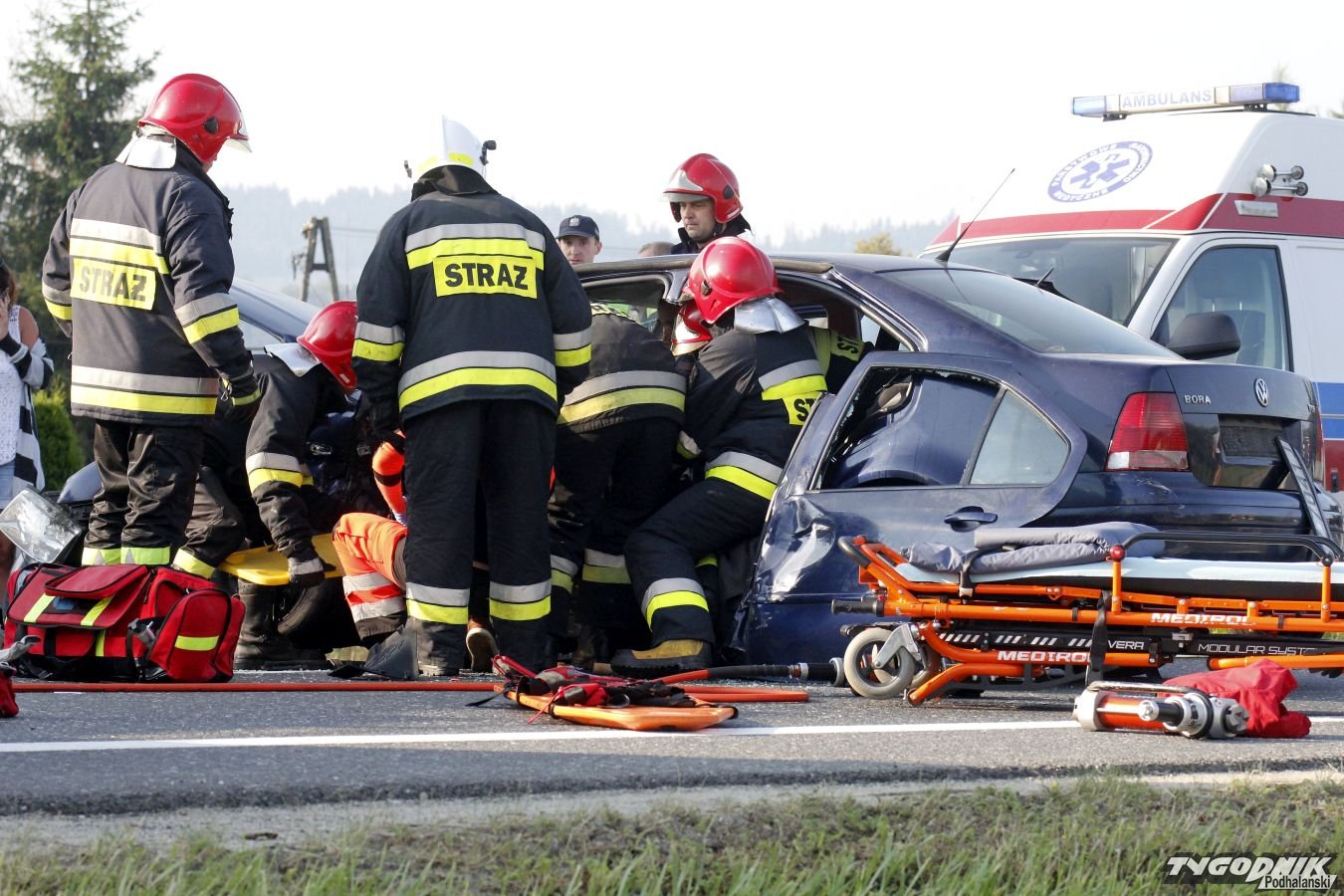 Wypadek zdarzył się około 7 rano na krajowej siódemce w Skawie. Na prostym odcinku drogi zderzyły się dwa auta osobowe: fiat na nowotarskich numerach oraz volkswagen zarejestrowany na Śląsku. Tuż po kolizji fiat dachował, natomiast mocno uszkodzony volkswagen pozostał na środku drogi.