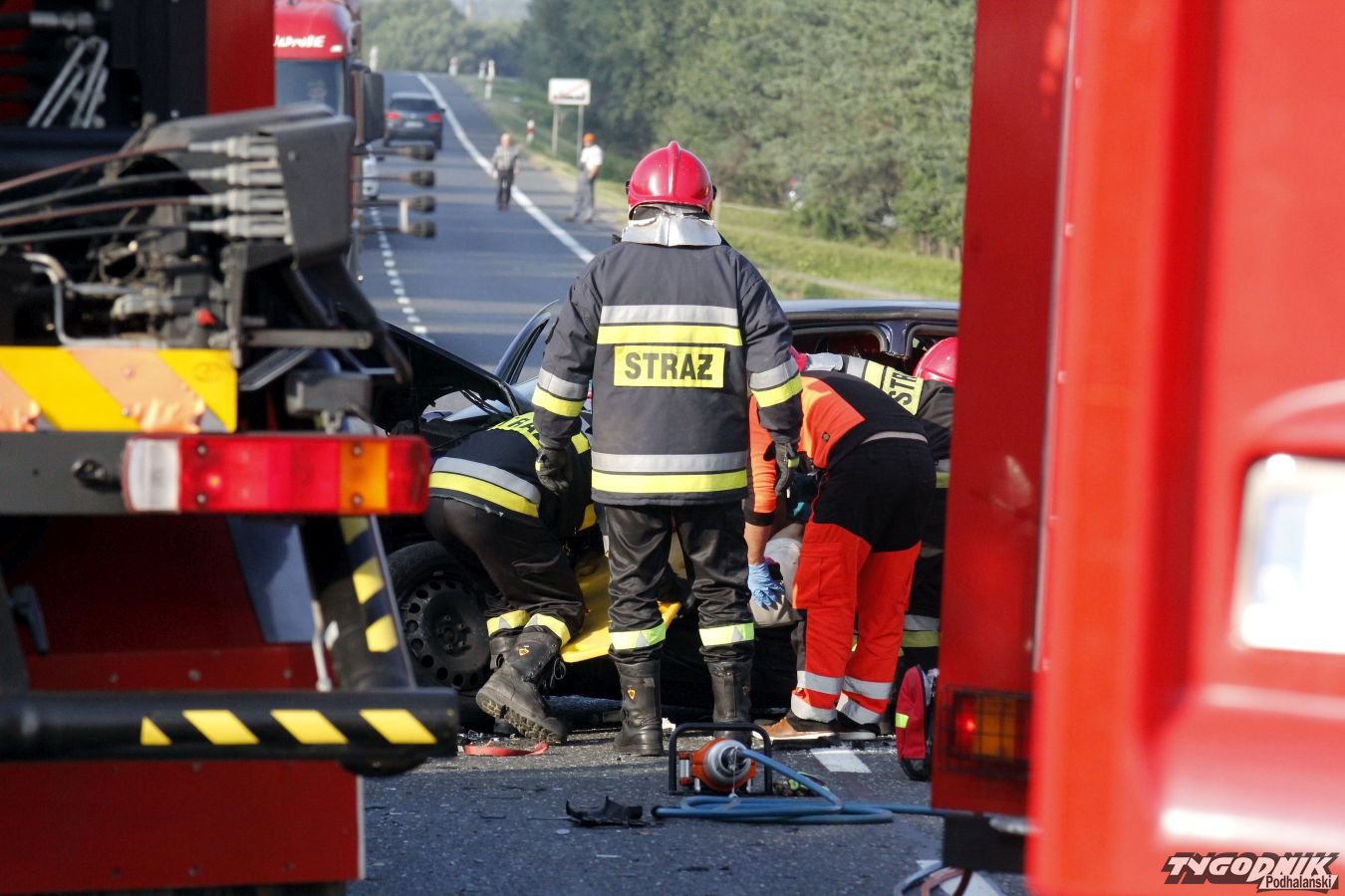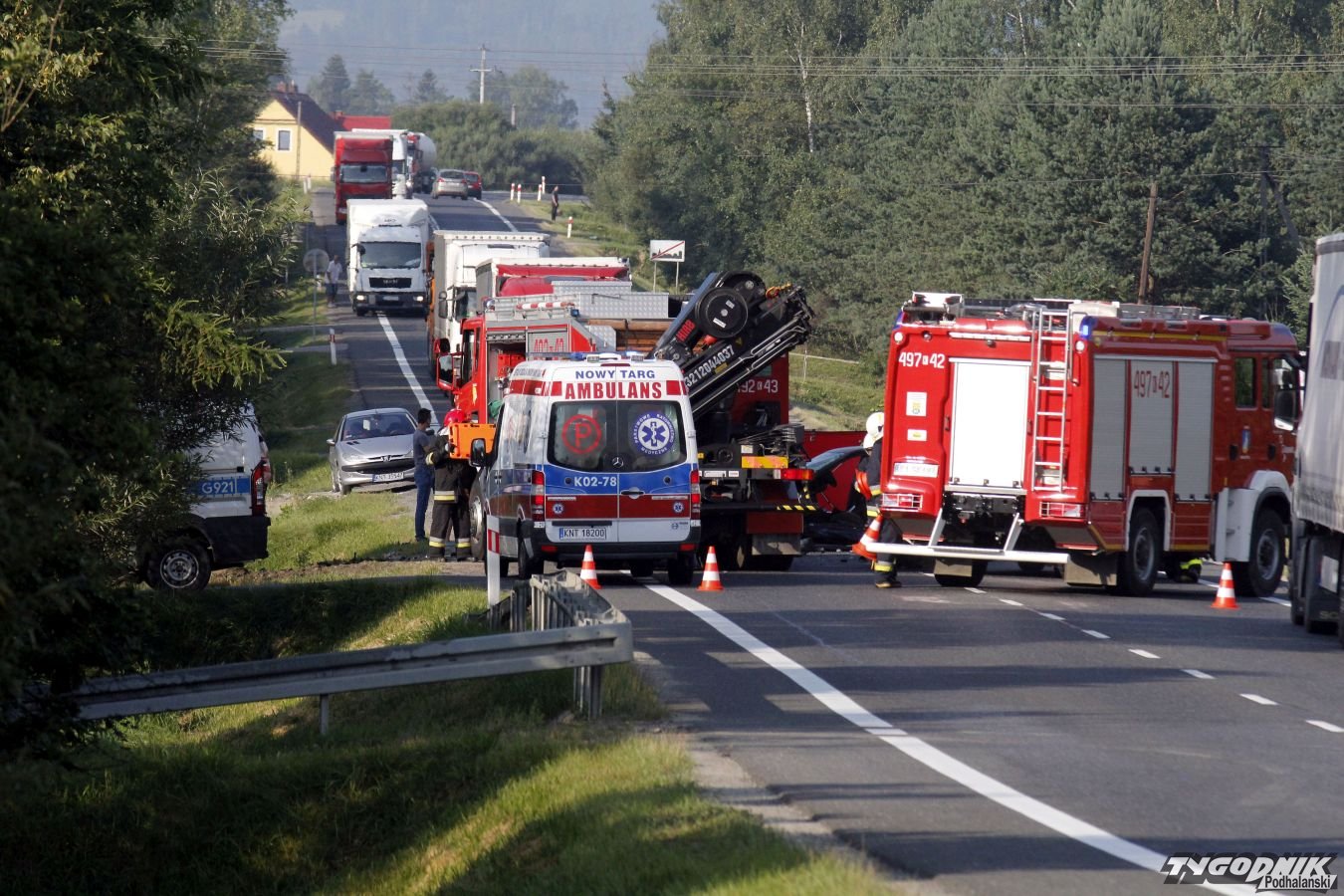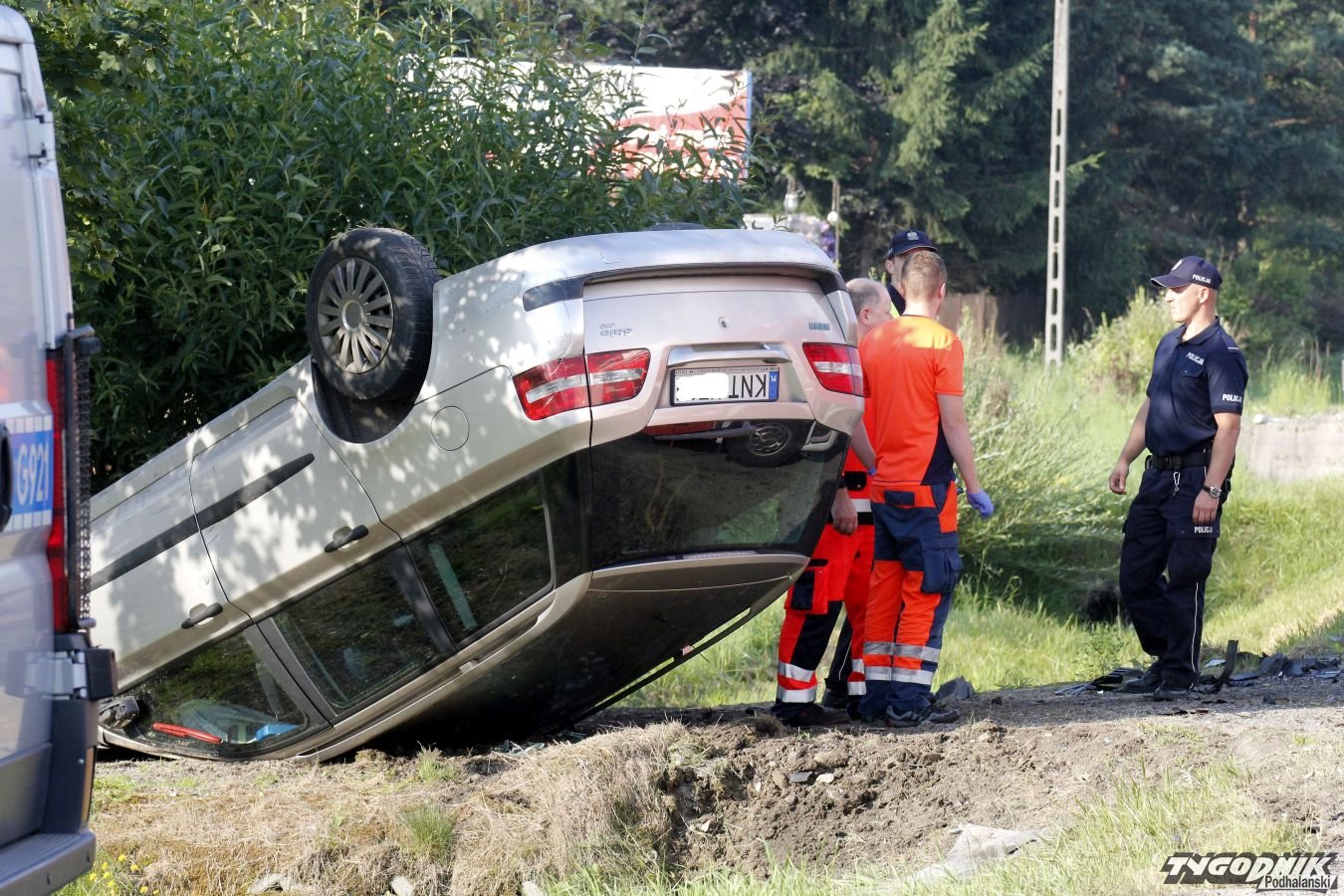 Wypadek zdarzył się około 7 rano na krajowej siódemce w Skawie. Na prostym odcinku drogi zderzyły się dwa auta osobowe: fiat na nowotarskich numerach oraz volkswagen zarejestrowany na Śląsku. Tuż po kolizji fiat dachował, natomiast mocno uszkodzony volkswagen pozostał na środku drogi.