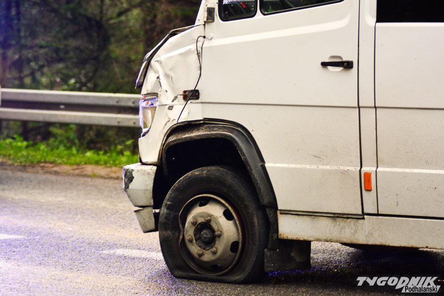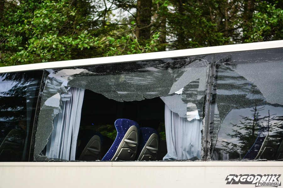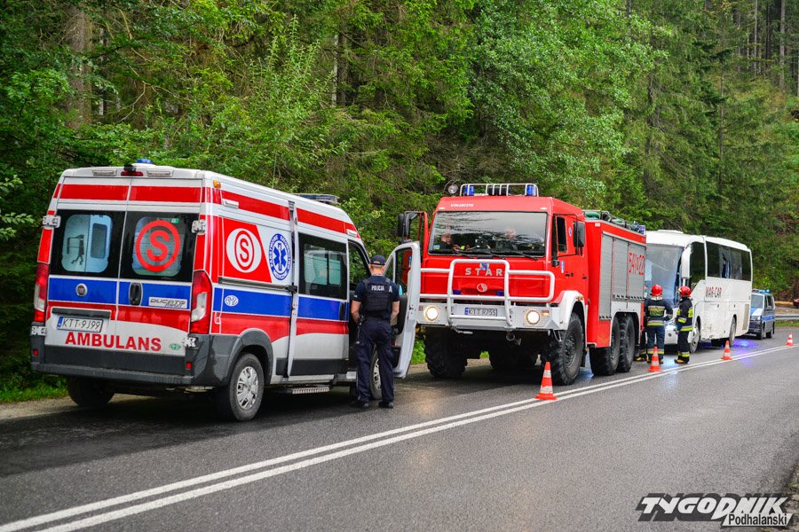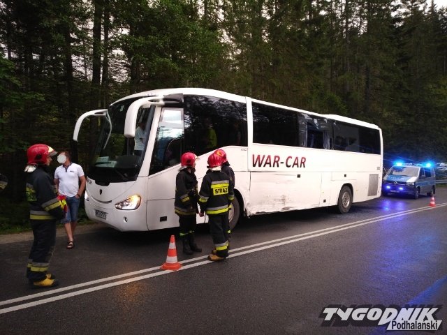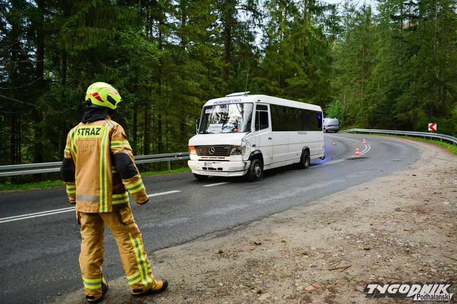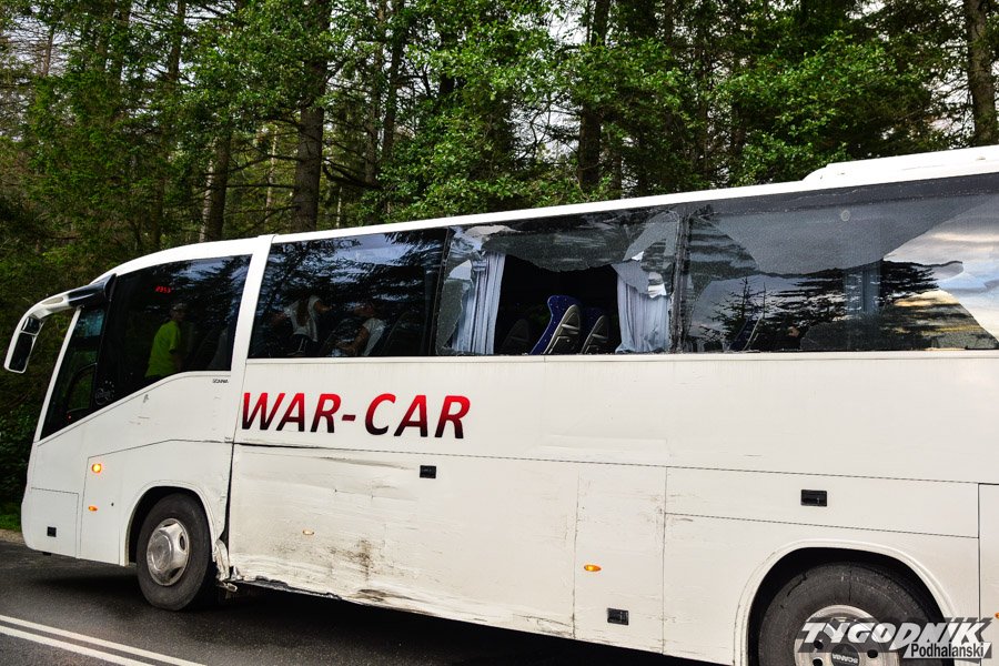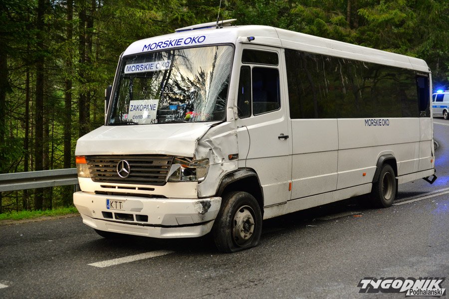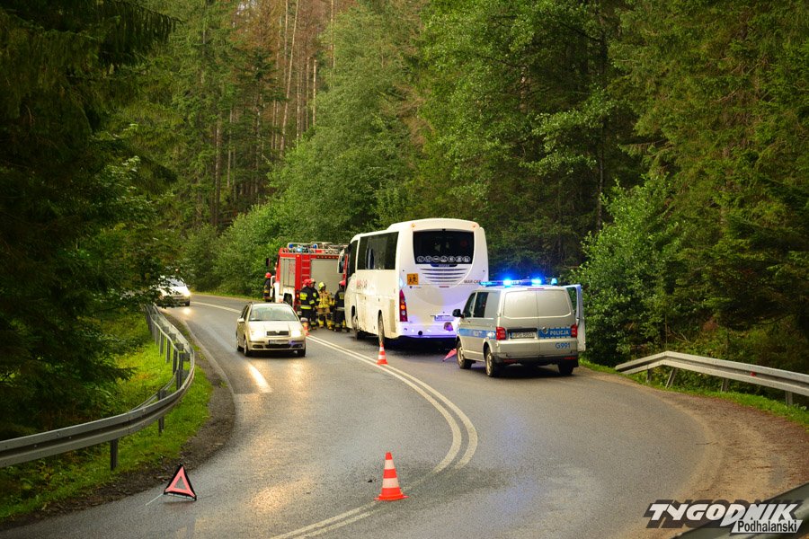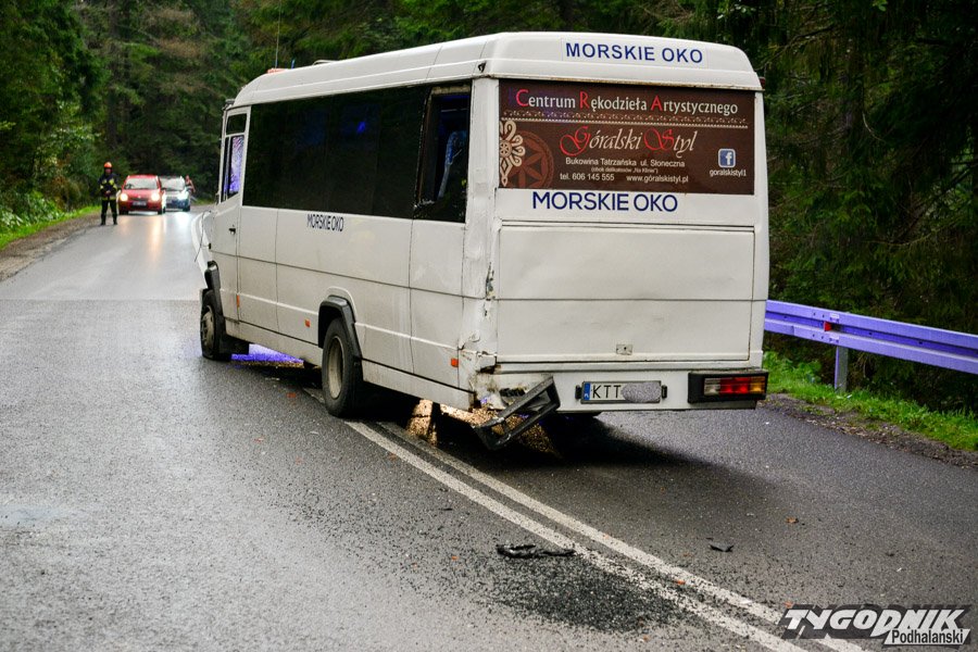 Jadący od strony Cyrhli bus kursujący na trasie z Morskiego Oka zjechał na przeciwległy pas i uderzył w autobus przewożący dzieci. Na szczęście żadnemu z dzieci nic poważnego się nie stało. W autobusie uszkodzony jest bok autobusu, wypadła też z niego boczna szyba.