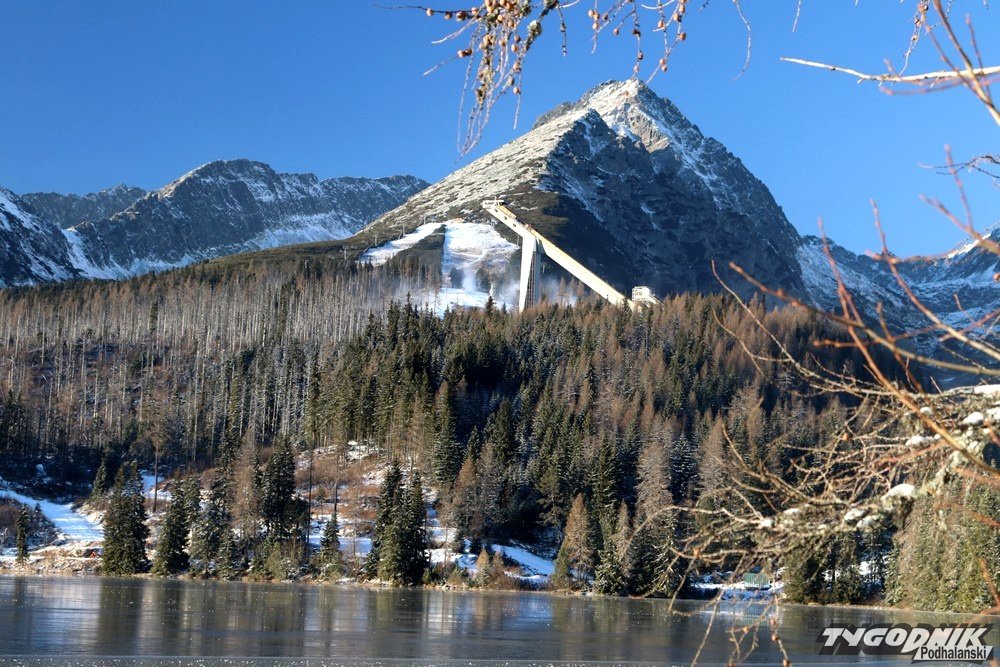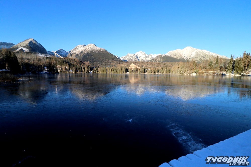 Temperatura już - 7 st. C., ale na niebie trudno odnaleźć chociażby jedna chmurkę. Widoki cudowne. Na zdjęciach obok Szczyrbskie Pleso, niemal o połowę mniejsze niż Morskie Oko, ale również piękne.
