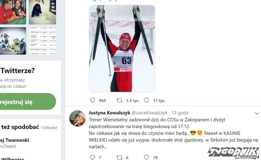 Justyna Kowalczyk na Twitterze pisze o braku naśnieżonych tras w Zakopanem