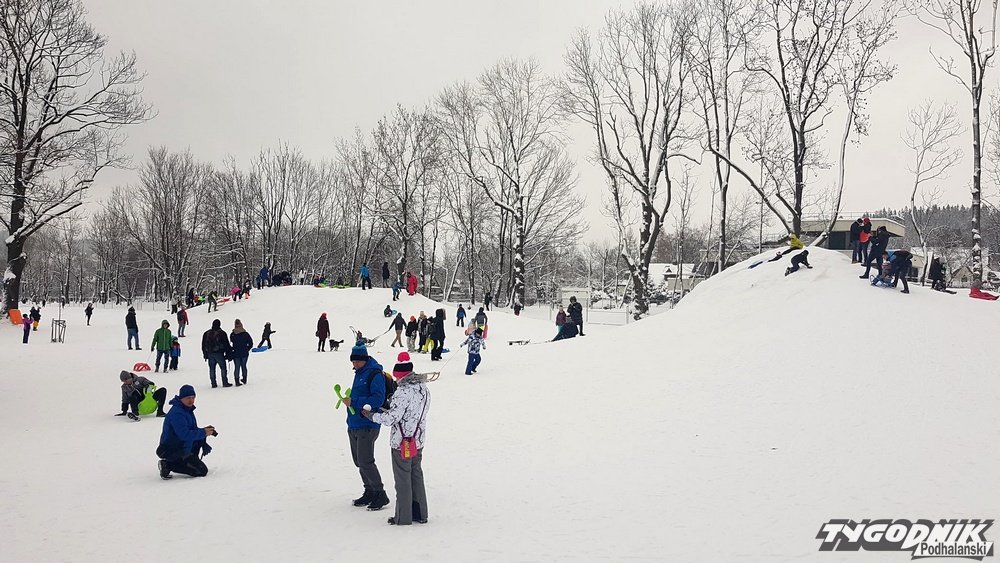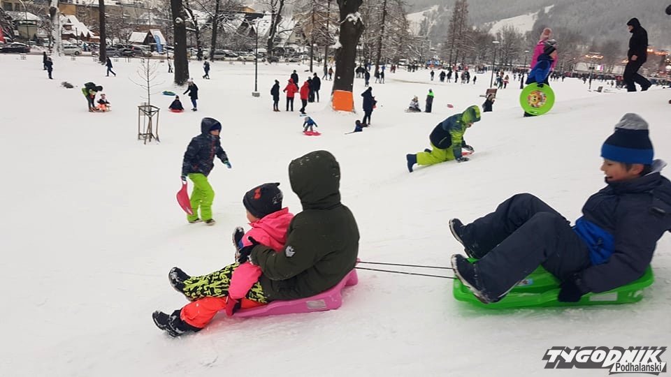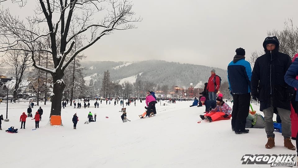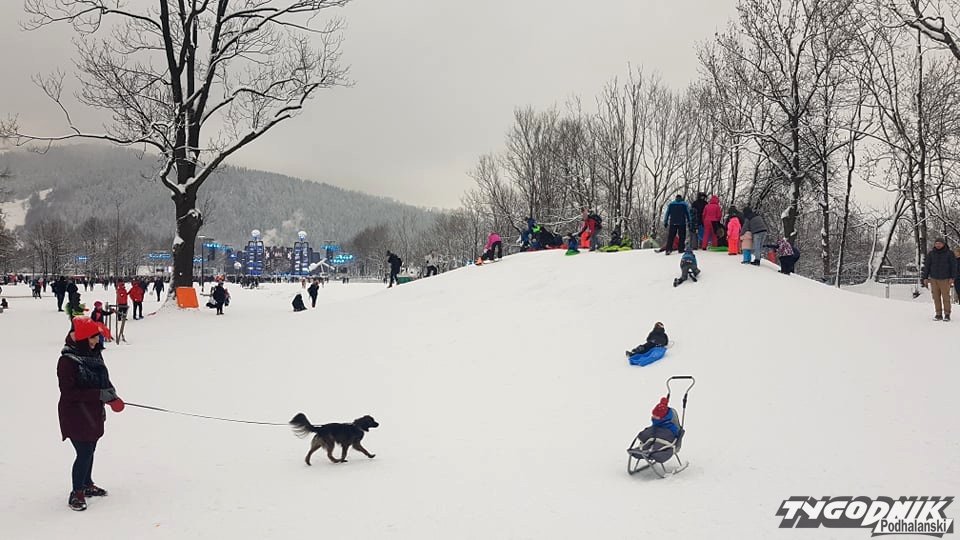 W tle trwają próby przed sylwestrem, a na górce saneczkowej tłumy.