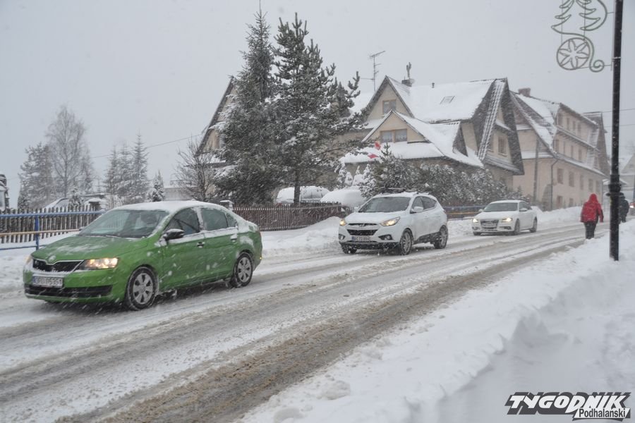 Korek jest w stronę Białki Tatrzańskiej. Do tego cały czas intensywnie pada śnieg. Na drodze panują trudne warunki.