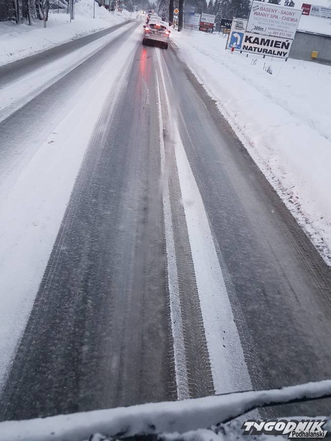 Kierowca busa obsługującego trasę z Nowego Targu na Orawę apeluje, żeby drogowcy w końcu posypali odcinek drogi wojewódzkiej koło dawnego Kombinatu.