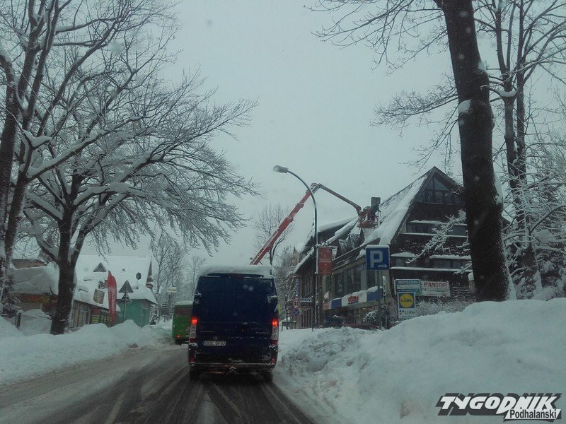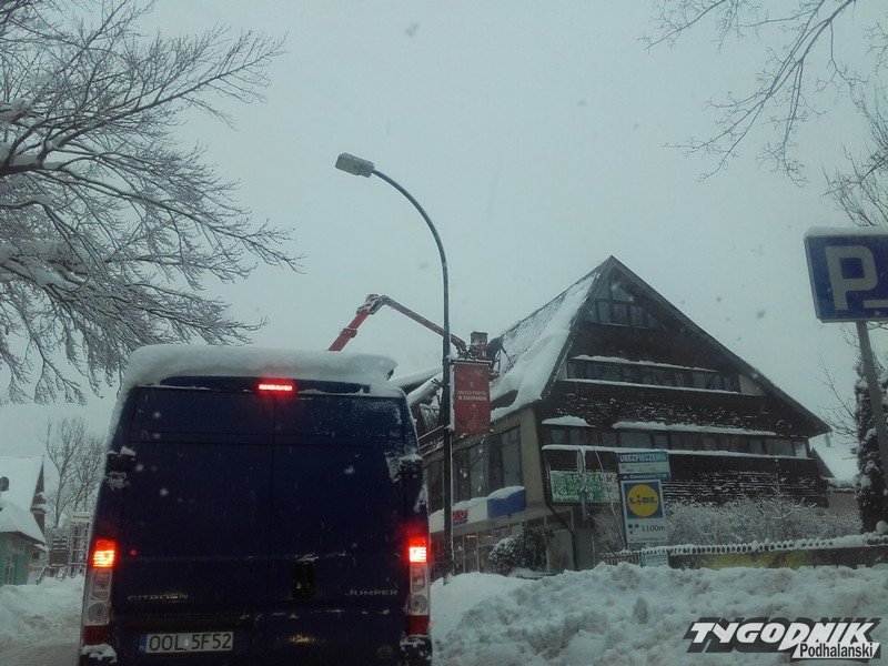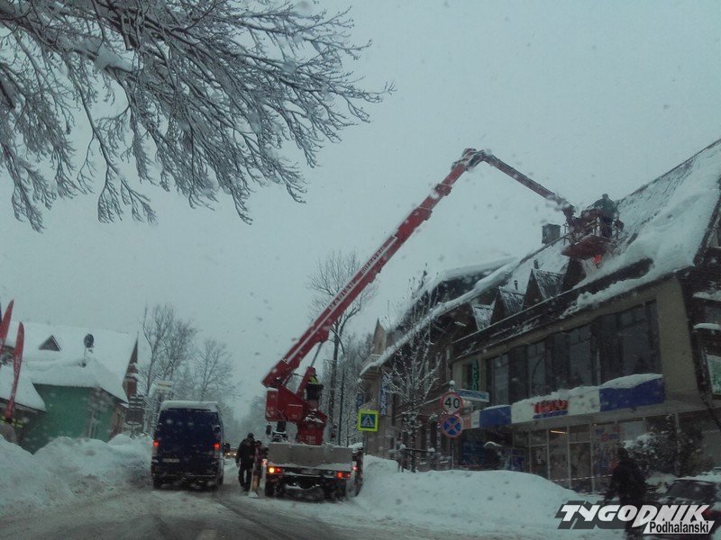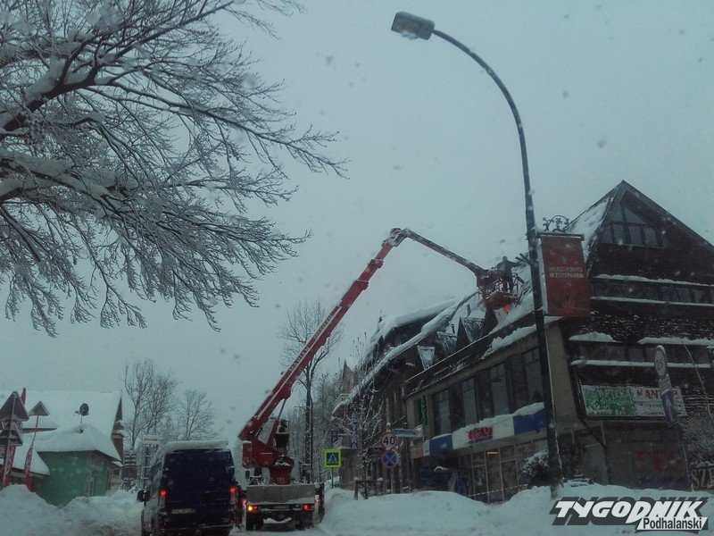 W wielu miejscach Zakopanego bez podnośnika nie ma możliwości odśnieżyć dachów. Dziś od rana trwała akcja usuwania grubej warstwy śniegu z połaci dachowych na budynku u zbiegu ulic Chramcówki i Gimnazjalnej. Ciężkie auto blokowało na czas akcji pas jezdni, utrudniając przejazd na wylotowej ulicy miasta.