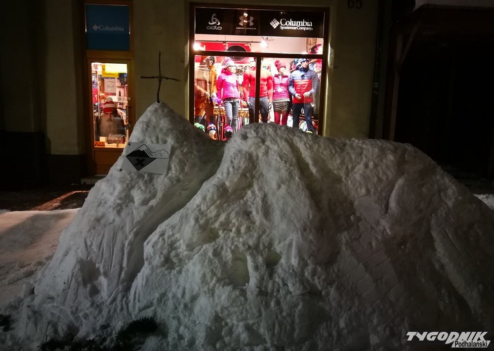 Taki oto Giewont zbudowali ze śniegu pracownicy sklepu Alpin Sport. Jest znajomy kształt, krzyż, a nawet informacja o zagrożeniu lawinowym.