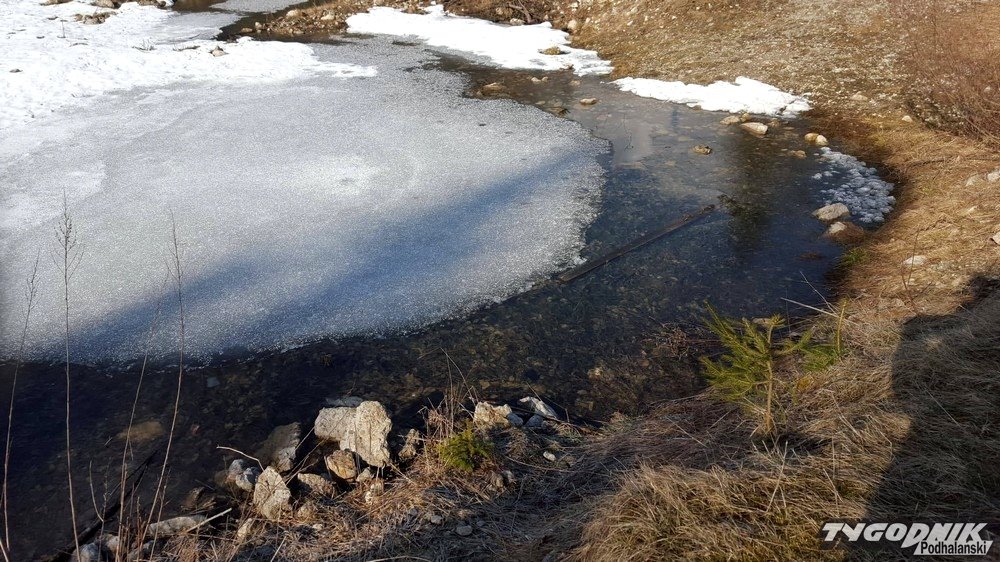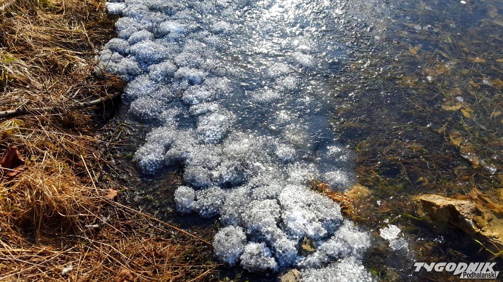 Mroźna noc sprawiła, że małe stawy w Zakopanem pokrył lód. Żabki nieco zaskoczone, bo już rozpoczęły swoje gody.