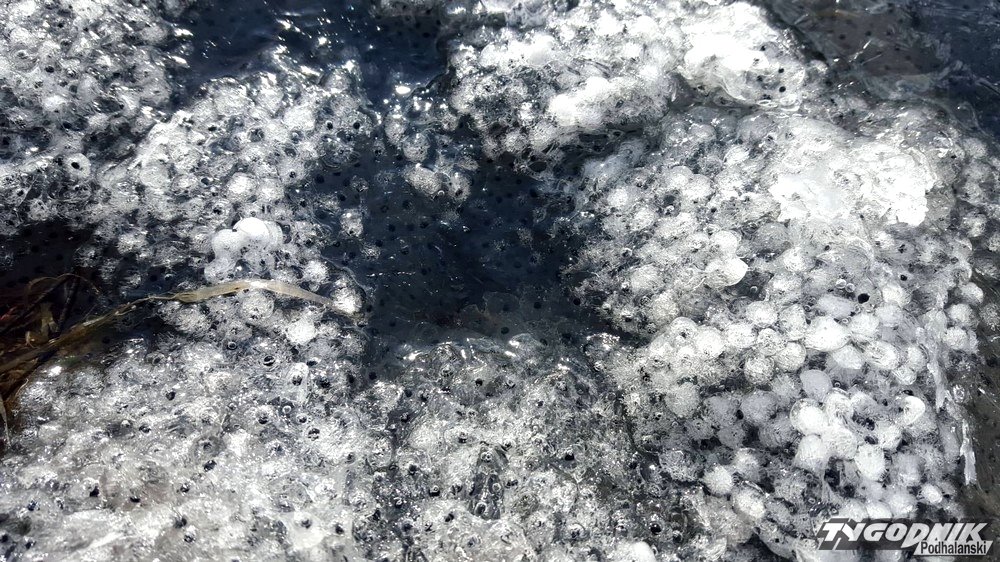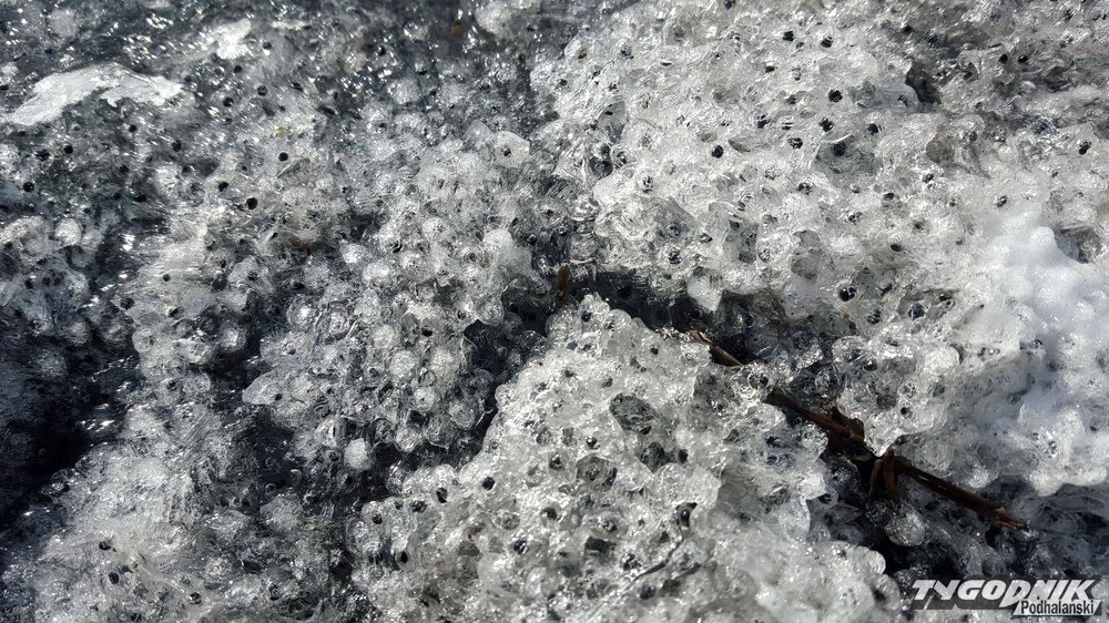 Na brzegach zbiorników wodnych można było dziś napotkać zamarznięty skrzek. Pod cienką warstwą lodu pływają żabki.