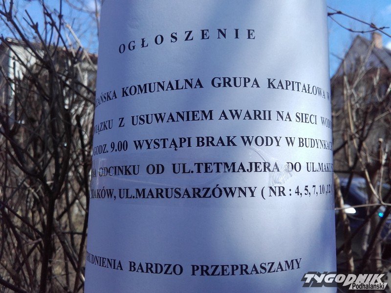 Na jutro miejskie wodociągi w Zakopanem zaplanowały odcięcie wody w domach przy ulicach: Ornak, Do Tadziaków, Marusarzówny i Grunwaldzkiej na odcinku od ul. Tetmajera do ul. Makuszyńskiego.